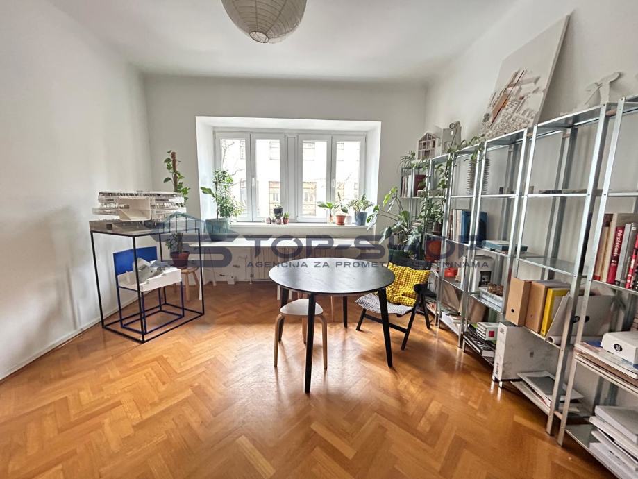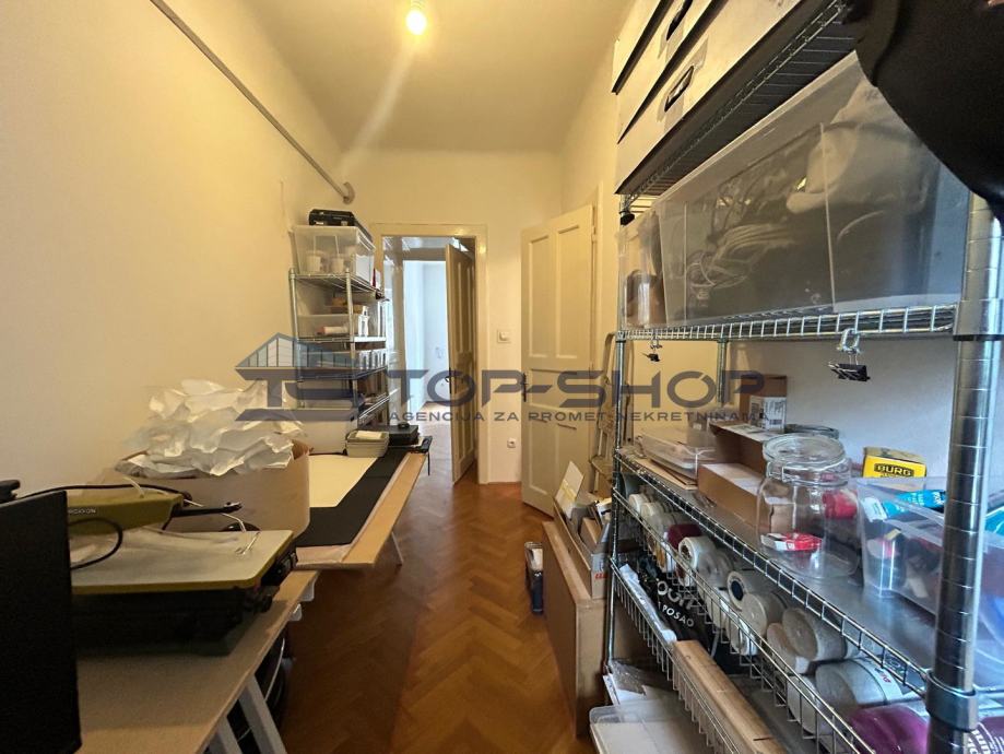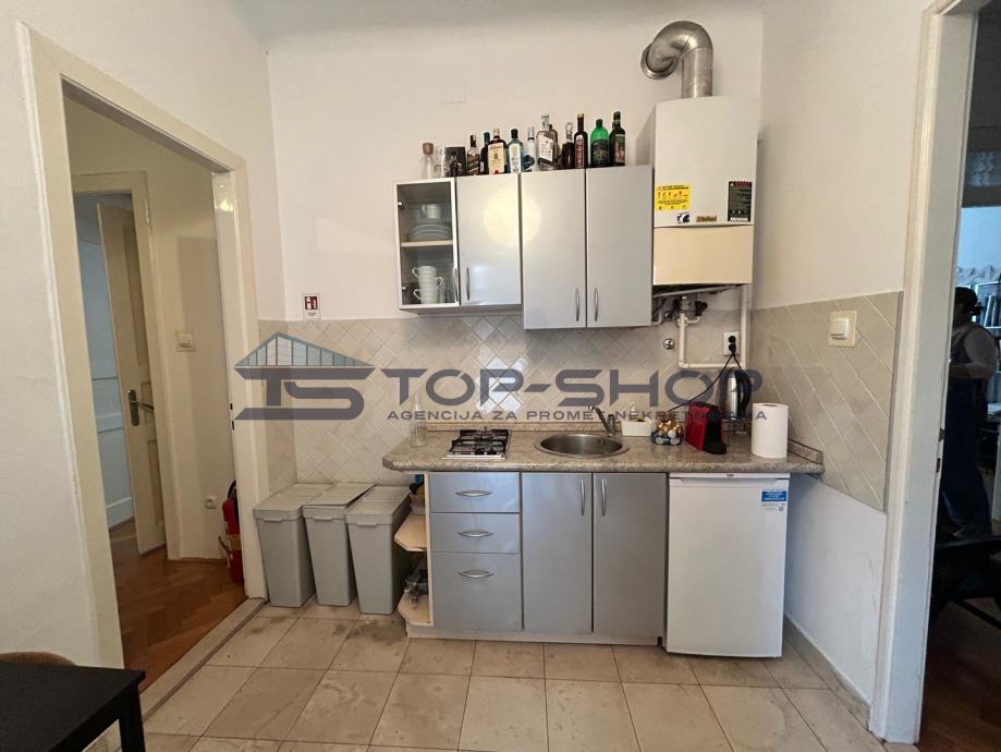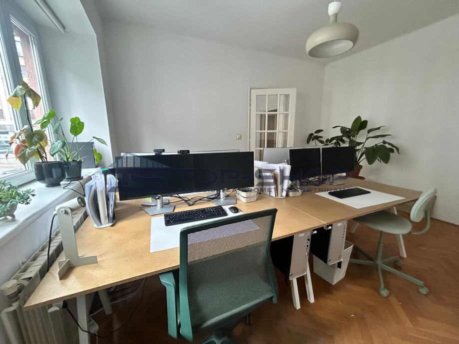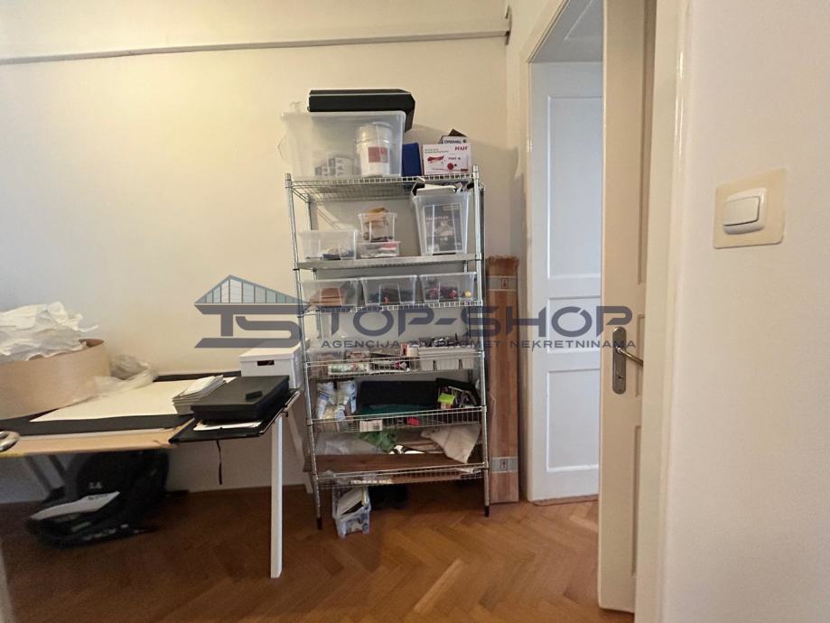 Ovaj uredski prostor sastoji se od 2 velike sobe od 18 m2 (od kojih je jedna služila kao soba za klijente) blagavaonice sa kuhinjom, spremištem, kupaonom, balkonom s pogledom na dvorište. Prostor je trenutno uređen kako je prikazano na slici te se kombinacije vezano uz namještaj mogu dogovoriti sa zainteresiranima.