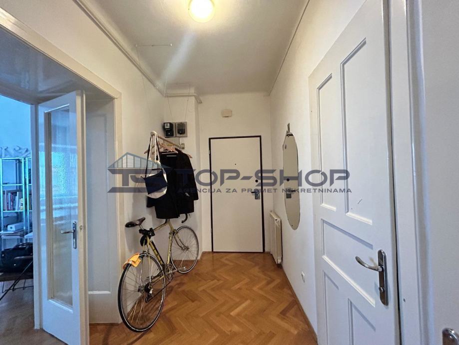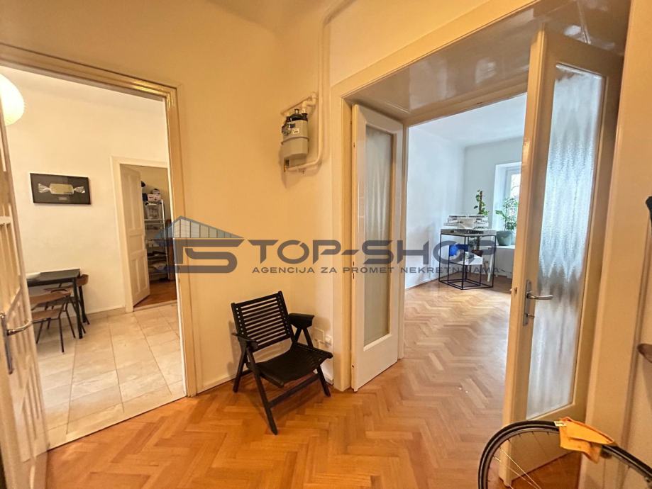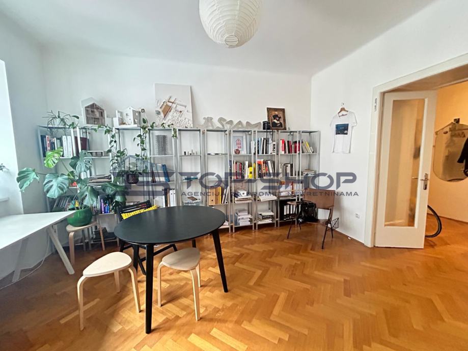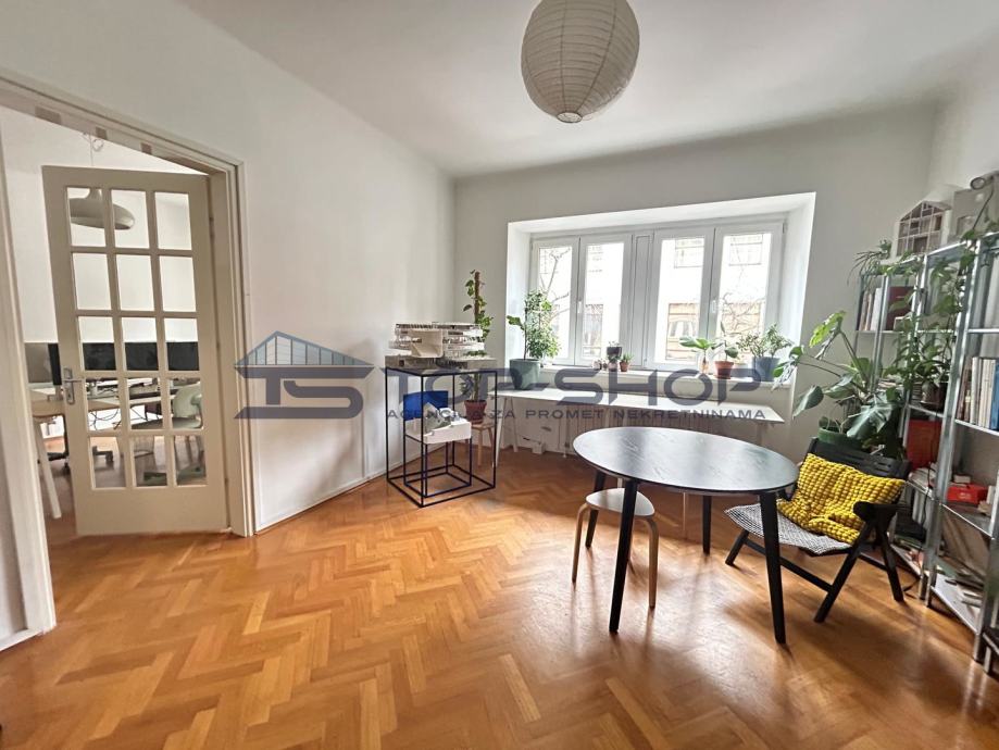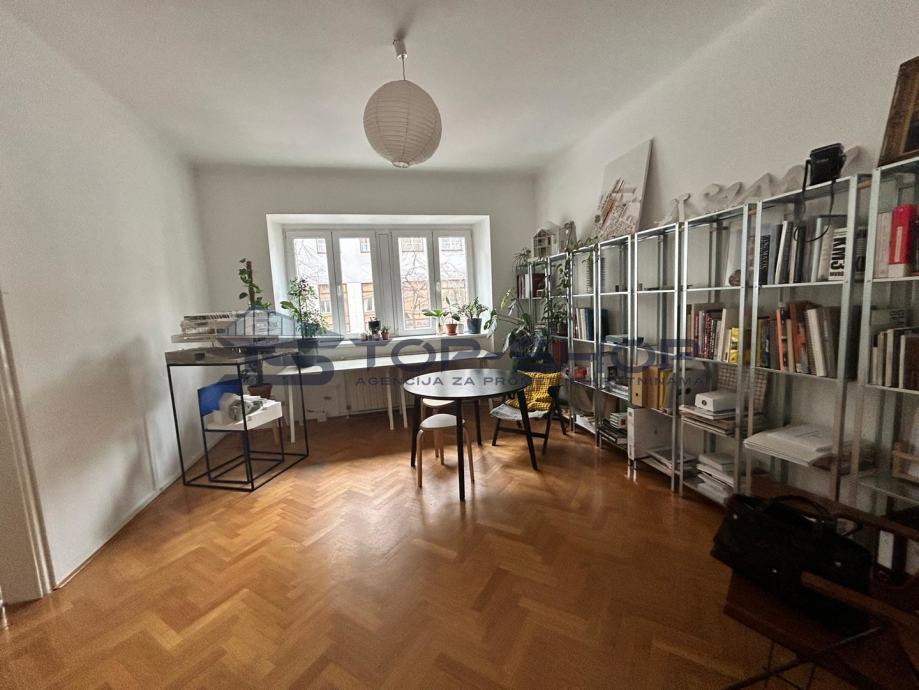 Ovaj uredski prostor sastoji se od 2 velike sobe od 18 m2 (od kojih je jedna služila kao soba za klijente) blagavaonice sa kuhinjom, spremištem, kupaonom, balkonom s pogledom na dvorište. Prostor je trenutno uređen kako je prikazano na slici te se kombinacije vezano uz namještaj mogu dogovoriti sa zainteresiranima.