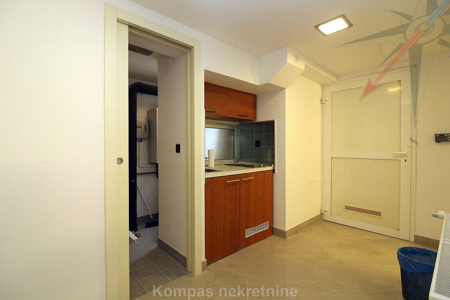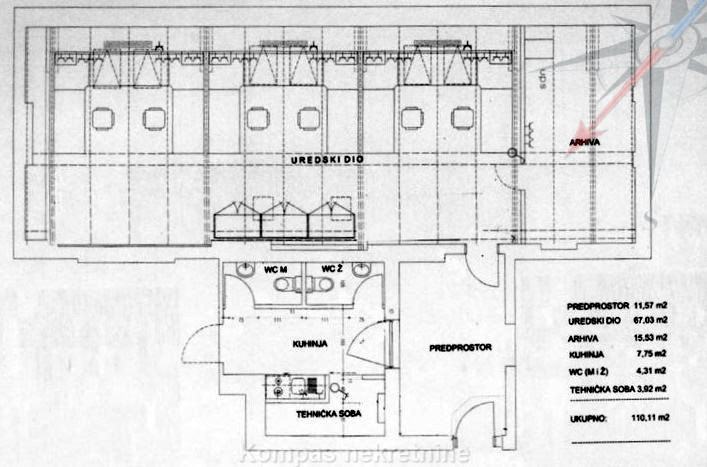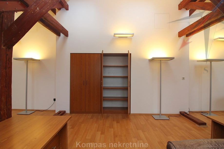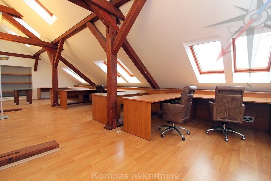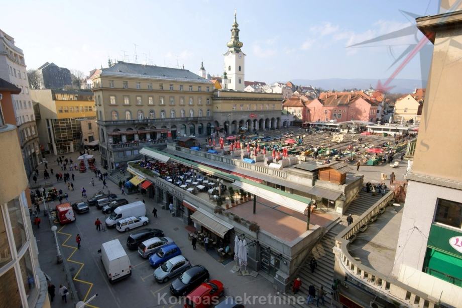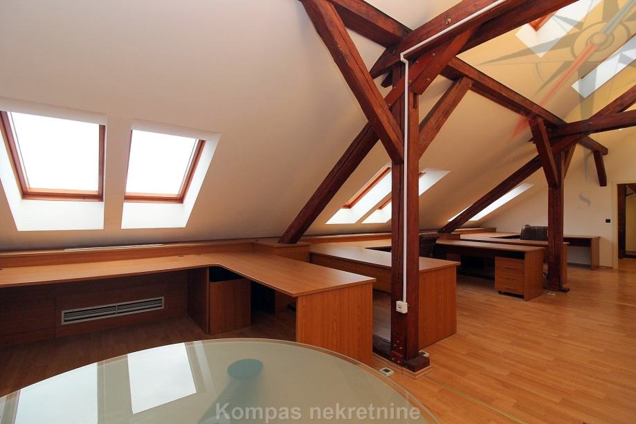 Nenamješten ured ( 110 m2 ) na četvrtom katu ( potkrovlje ) stambene zgrade bez lifta, Trg bana Jelačića. Sastoji se od ulaznog prostora, čajne kuhinje, otvorenog prostora ( 67 m2 ), dva toaleta, arhive. Ima optički internet, klima uređaj, plinsko grijanje, informatičku mrežu. Grijanje i hlađenje je preko fan coil jedinica. Pričuvu za prostor plaća zakupodavac, a režije i sve ostale naknade plaća zakupac. Zgrada je temeljito rekonstruirana, obnovljena je originalna bravarija, stolarija, vitraji, stropne štukature i kaljeve peći. U planu je ugradnja lifta. Ured se nalazi u neposrednoj blizini javnog prijevoza i svih sadržaja strogog centra grada. Daje se u zakup se na minimalno dvije godine.