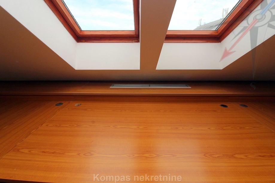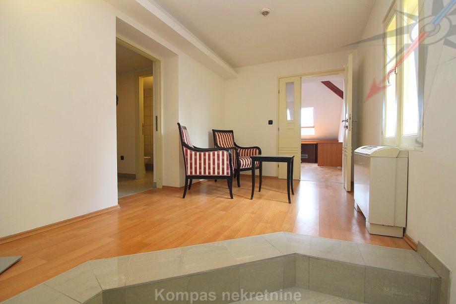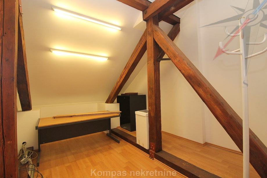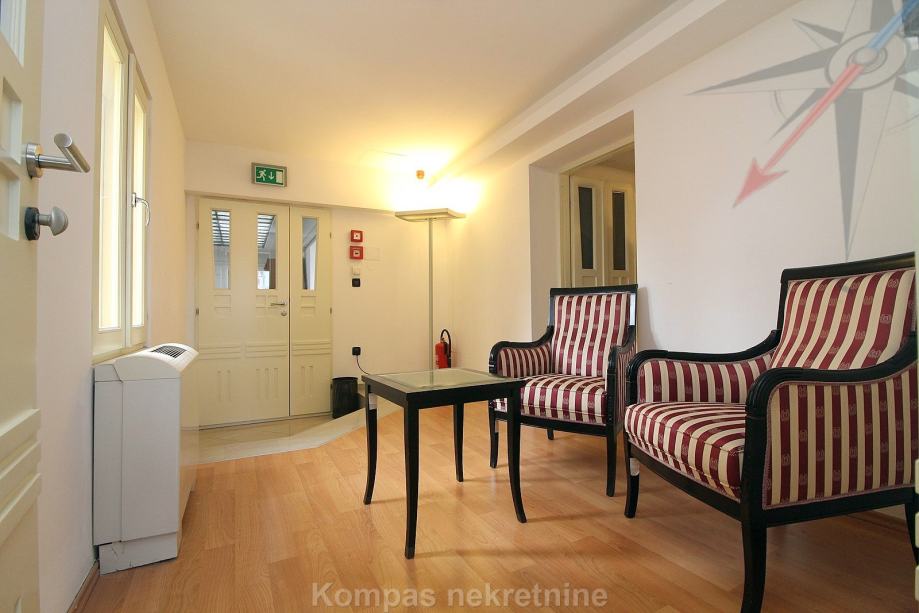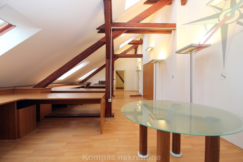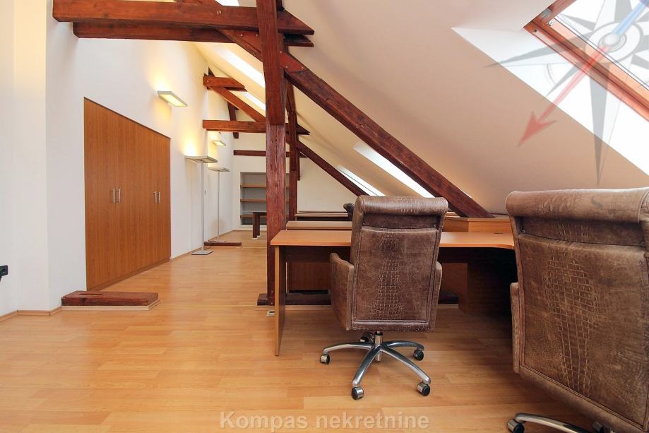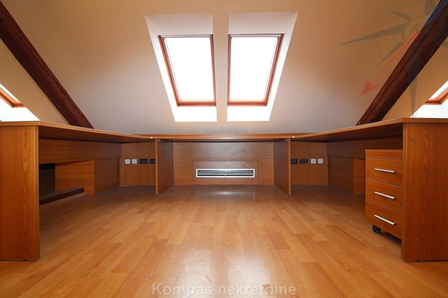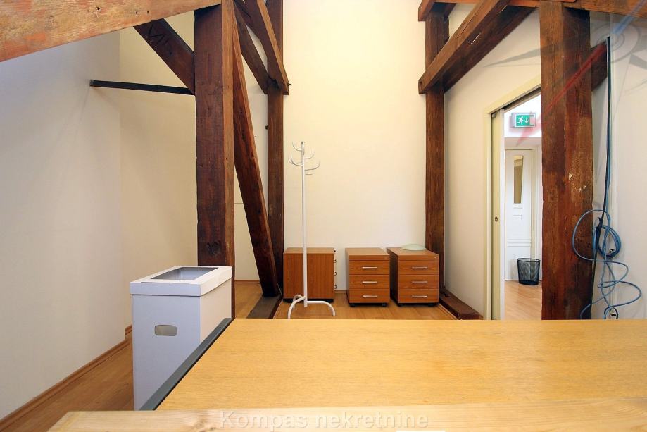 Unfurnished office (110 m2) on the fourth floor (attic) of a residential building without an elevator, Ban Jelačić Square. It consists of an entrance area, kitchenette, open space (67 m2), two toilets, archive. It has optical internet, air conditioning, gas heating, IT network. Heating and cooling is via fan coil units. The lessor pays the building reserve and the tenant pays the utilities and all other fees. The building has been thoroughly reconstructed, the original locksmithing, joinery, stained glass windows, ceiling stucco and tiled stoves have been restored. An elevator is planned to be installed. The office is located in close proximity to public transport and all amenities of the city center. For rent for a minimum of two years.
