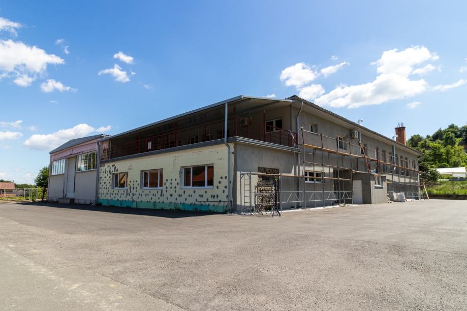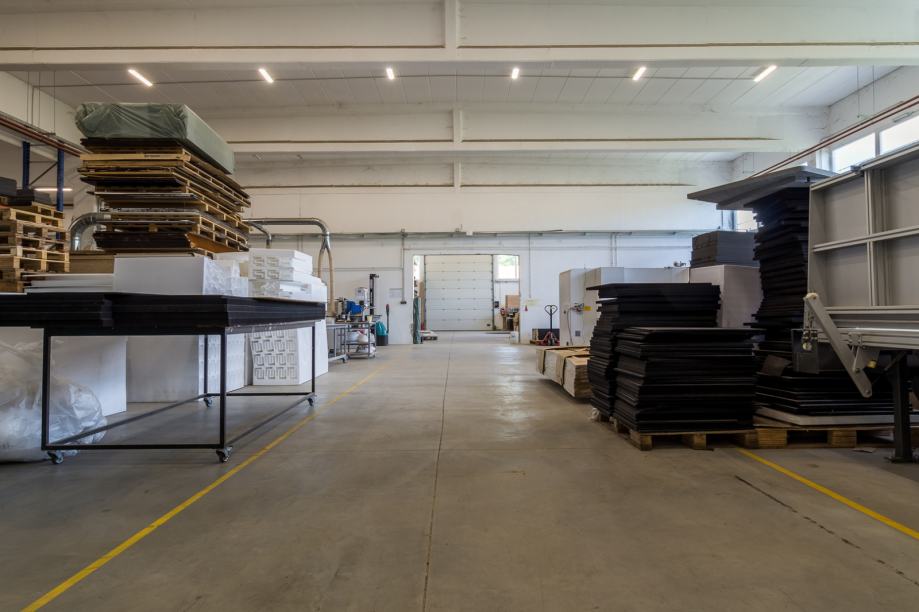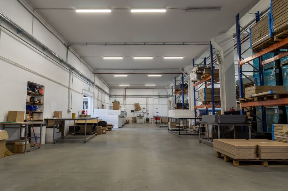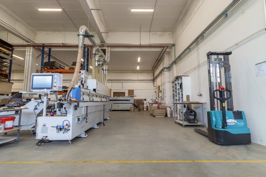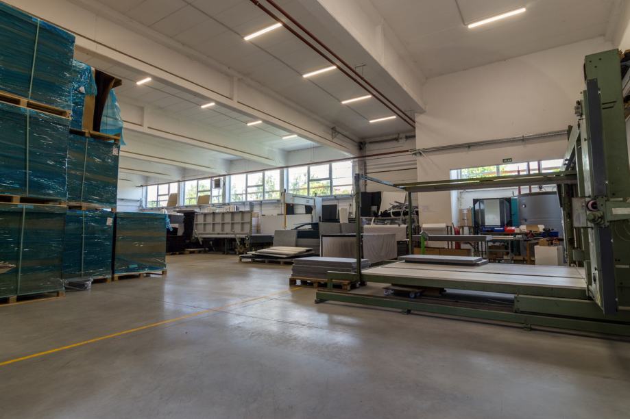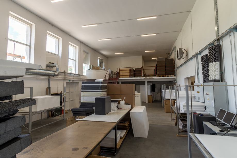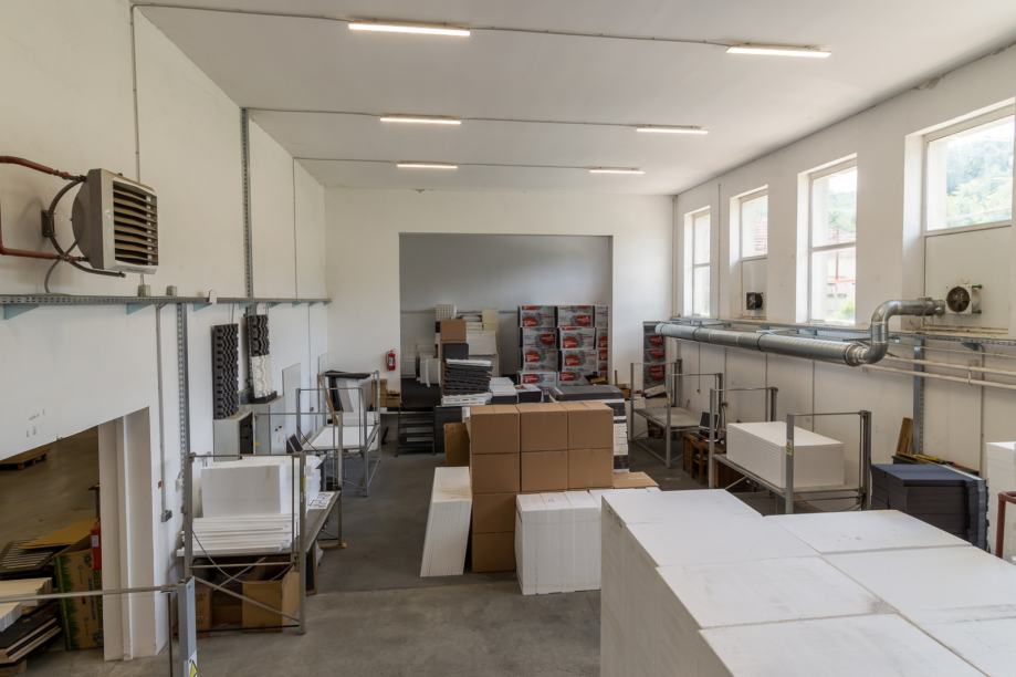 Prizemlje (1.468 m2) obuhvaća tri velika proizvodna pogona, dvije manje radionice, dvije skladišne prostorije, dva sanitarna čvora, kotlovnicu te glavni hodnik s ulaznim prostorom.
