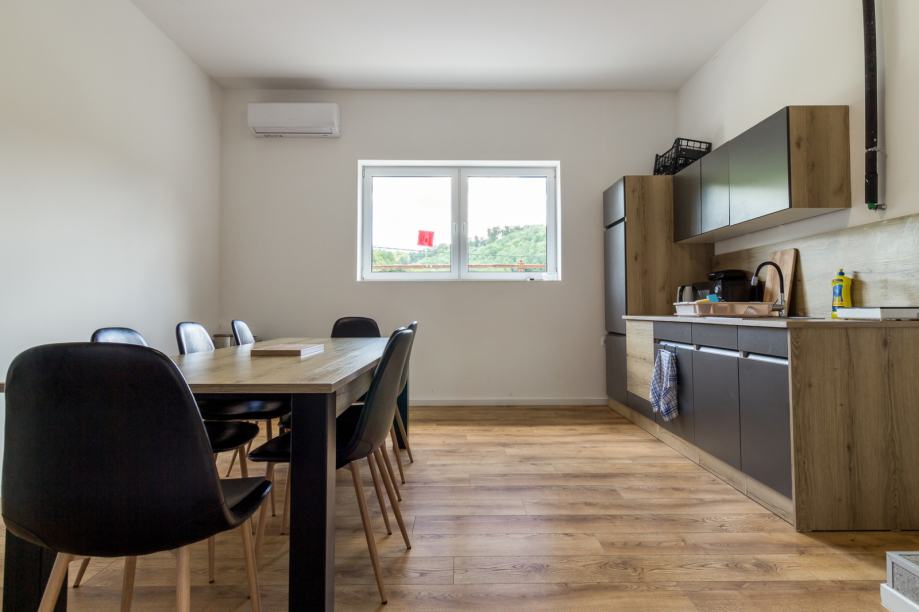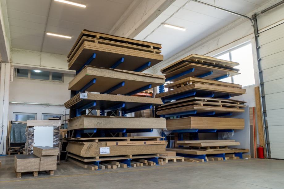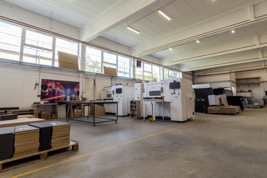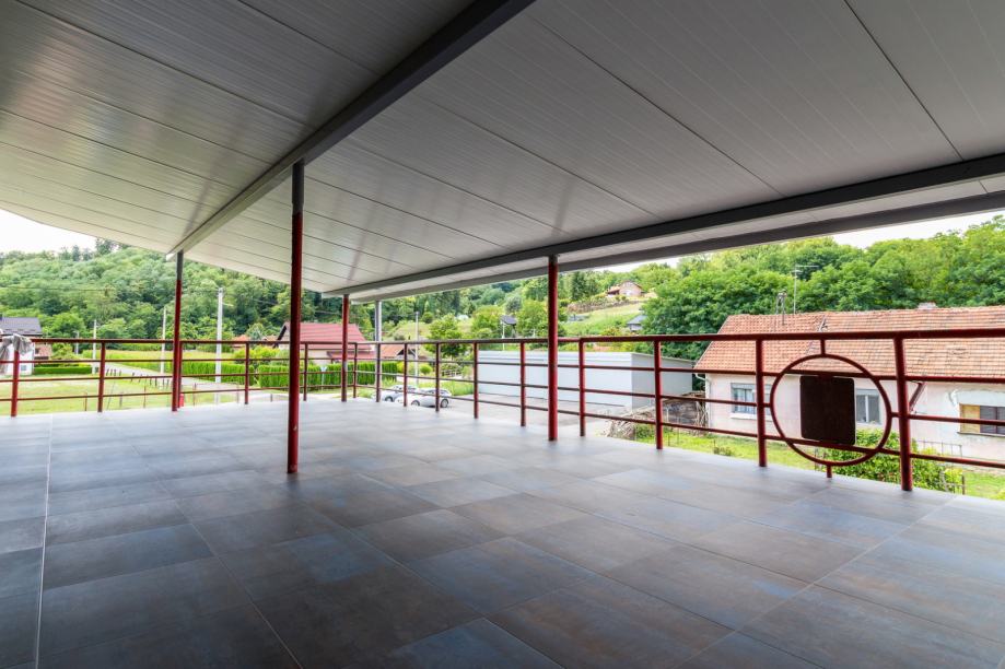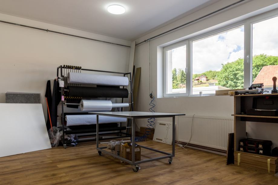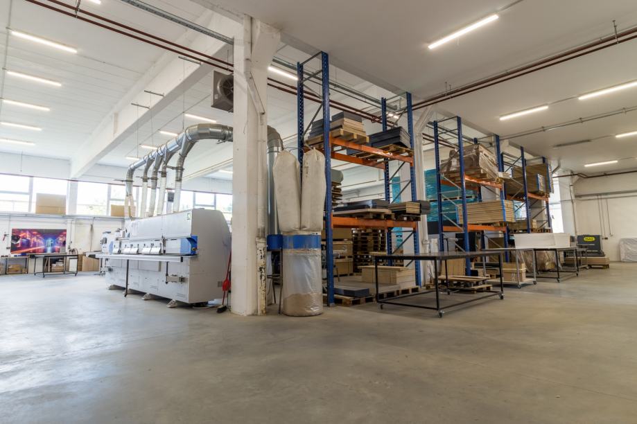 Kat (280 m2) uključuje dva ureda s pogledom na proizvodni prostor, kuhinju s blagovaonicom, spremište koje se može koristiti kao garderoba te veliku natkrivenu terasu s pogledom na zelenilo.