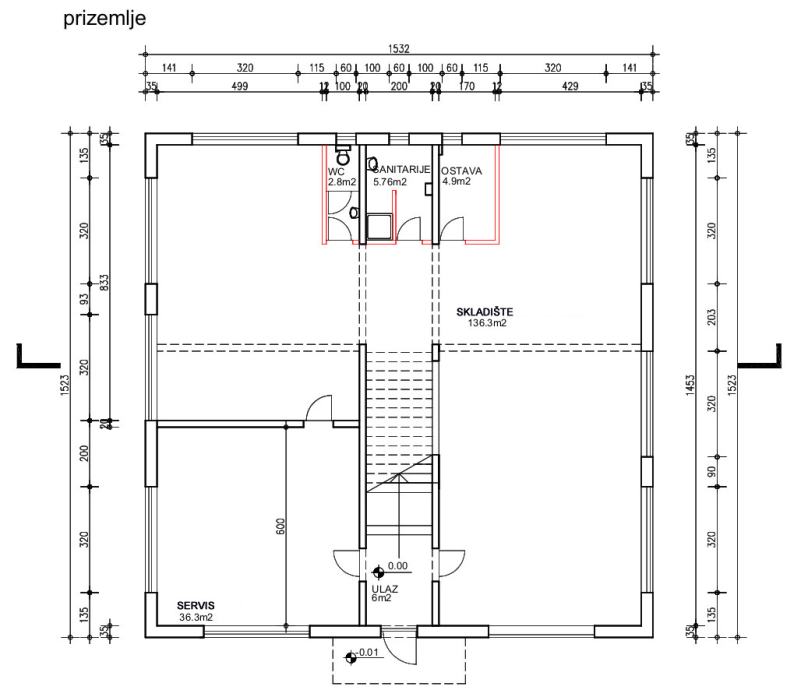 Glavna zgrada je 2010. g. vrlo kvalitetno izgrađena klasičnim načinom gradnje; temelji su izvedeni od armiranog betona, zidovi od šuplje blok opeke, a stropovi od ab montažnih gredica. Zidovi su ukrućeni horizontalnim i vertikalnim ab serklažima. Unutarnje stubište izvedeno je kao armirano betonsko obloženo ukrasnim mramorom. Pregradni zidovi su izvedeni od pregradne opeke i žbukani. Krovište je drveno četverostrešno, a krov pokriven crijepom. Odvodnja atmosferske vode vrši se horizontalnim I vertikalnim bakrenim žljebovima te kanalima smještenim ispod asfalta na parceli.Vanjska stolarija je kombinacija drvo-aluminij. Za zaštitu od sunca ugrađene su aluminijske rolete. Pročelje je obloženo etics sustavom s polistirenom debljine 12cm. U prizemlju površine 231m2, svjetle visine 3m, nalaze se servisni prostor, skladište i WC i kupaona, a na katu površine 231m2, svijetle visine 2,7m, su uredski prostori, 2 WCa i čajna kuhinja. Pod u skladištu je vrhunski industrijski, u servisnom i uredskom prostoru hrastov klasični parket, a u sanitarijama i kuhinji keramičke pločice.