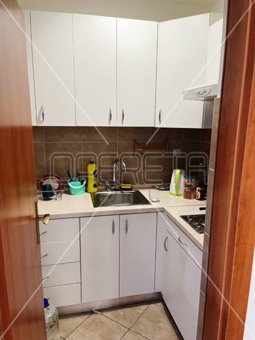 Kuhinja je manjih dimenzija, ali je opremljena svim potrebnim uređajima, uključujući sudoper, radnu ploču te ormariće za odlaganje, što je čini idealnom za svakodnevnu pripremu obroka. Kupaonica je opremljena toaletom i umivaonikom, a dobro je održavana i dovoljno prostrana za pohranu higijenskih potrepština.