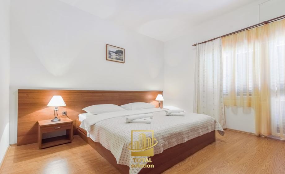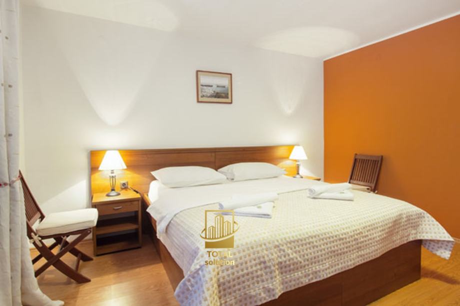 U Prizemlju se nalaze recepcija, bar, restoran sa ukupno 80 sjedećih mjesta uključujuči i prostranu terasu (40 + 40), profesionalno opremljena kuhinja, sanitarni čvorovi za goste i osoblje i pomoćne prostorije za poslovanje, dok ostale tri etaže sadrže 12 dvokrevetnih soba i 3 dvosobna apartmana. Svaka soba ima balkon sa prekrasnim pogledom na more i opremljena je klimom, TV- om, mini barom i radnim stolom. Kupaonice su u cijelosti obnovljene i potpuno opremljene.