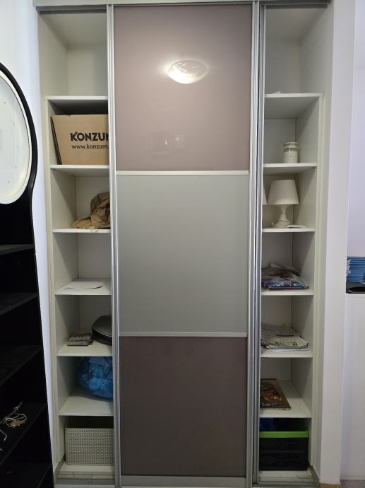 Opremljen velikim ugradbenim ormarom i bijelim ormarima koji su vidljivi na slikama.