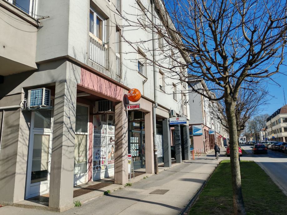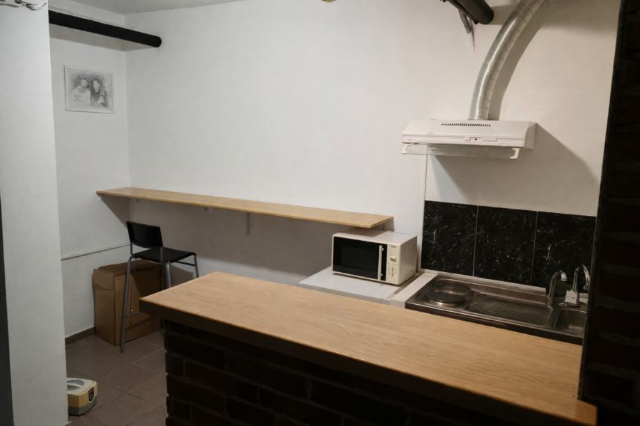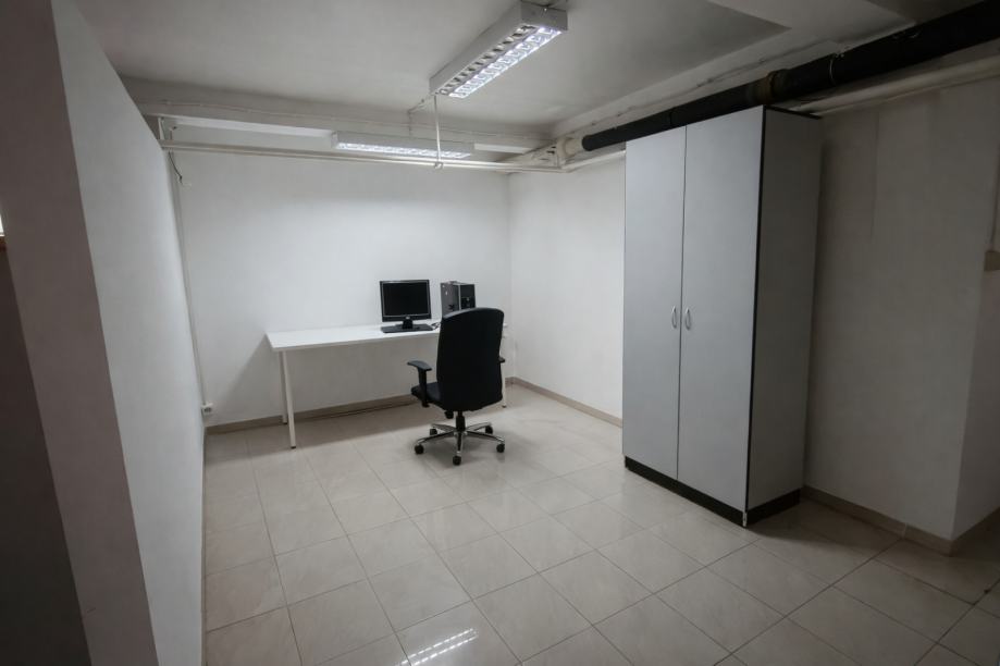 Poslovni prostor od 70 m² smješten je u sutorenu stambeno-poslovne zgrade izgrađene 1971. godine. Prostor je podijeljen u dvije prostorije, a pod je obložen keramičkim pločicama svjetle boje. Vidljivi instalacijski vodovi na stropu karakteristični su za suteren, a visoki prozori uz zid donose prirodno osvjetljenje.