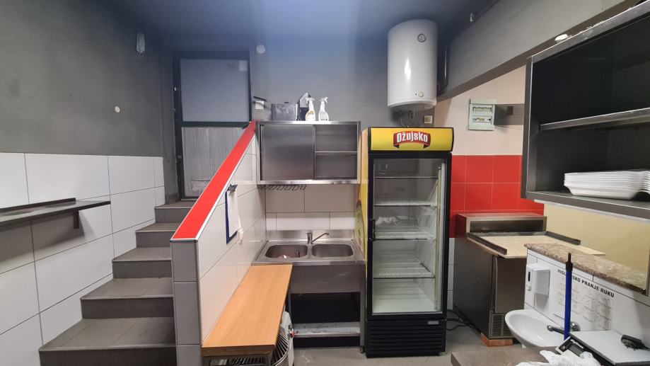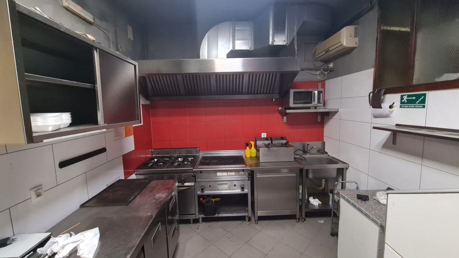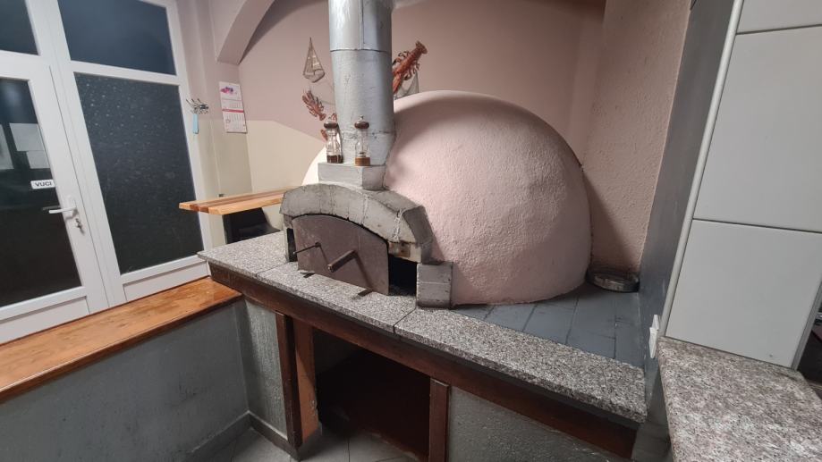 Inventar: krušna peć za pizzu, 2 frižidera, ledenica, plinski roštilj sa lava kamenom, pizza pult, mješalica za tijesto, friteza, mikrovalna, el. pećnica, plinski štednjak, skladište.