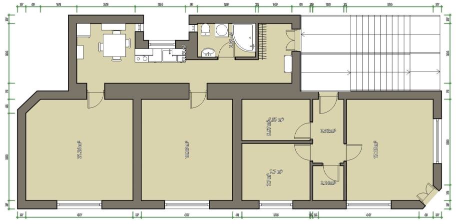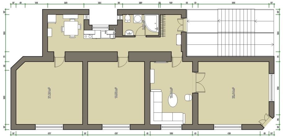 Izuzetno svijetao i prozračan prostor s puno dnevnog svjetla, zbog velikih prozora u prostranim sobama. Raspored prostorija je odličan za uredski prostor, ordinaciju, hostel, house za studente i sl., ali i stambeno. Starogradnja, debeli zidovi, visoka vrata te stropovi 3,2 m visine, pogled na ulicu i centar grada s balkona i dnevnog boravka. Stan je adaptiran 2015. g., knauf zidovi, novi podovi, keramika, novo kupatilo, sanitarije, kutna kada, a 2017. g. su stavljeni nova kuhinja, novi radijatori i kondenzacijski bojler. Stolarija je u lošijem stanju te ju je potrebno zamjeniti. Zgrada ima svoju povijest te znamenitost, a Grad je ostavio na izbor stanarima poštivanje stila pročelja zgrade kao kulturnog dobra, dok će sredstva za obnovu fasade, izolacije te moguće i prozora, biti osigurana kroz pričuvu i EU fondove.