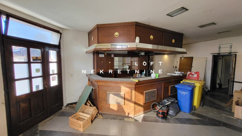 U prizemlju se nalaze dva poslovna prostora, jedan veličine 46,46 m2 u kojem se nalazio caffe bar s dva wc-a, te drugi koji je naknadno sagrađen u veličini 44,06 m2.