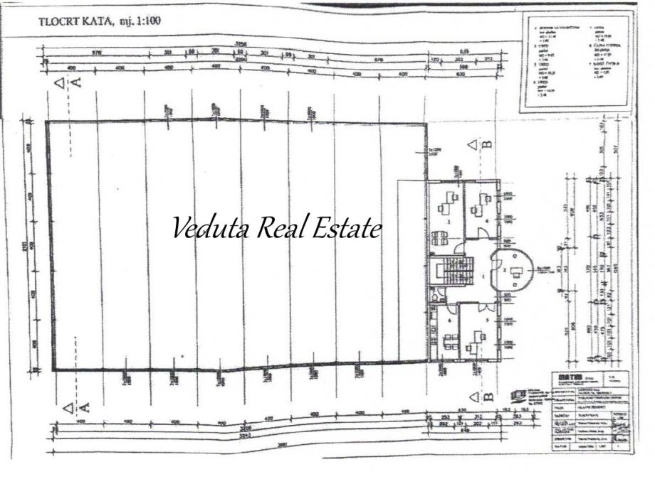 Sastoji od uredskog dijela u prizemlju i 1. katu, sveukupne površine 220 m2, te od skladišta/hale u prizemlju površine 620 m2.