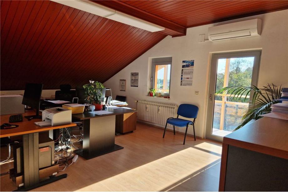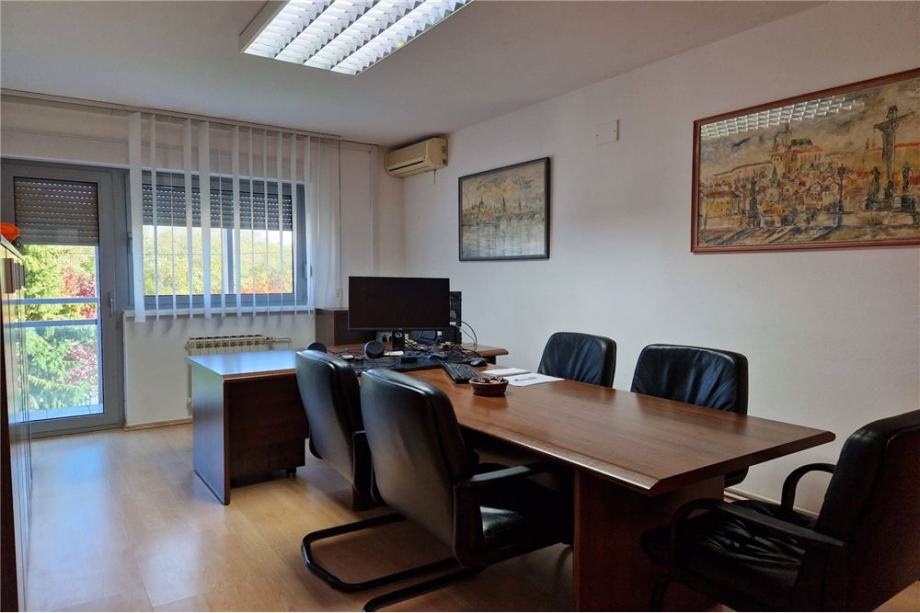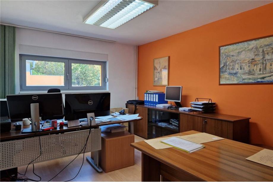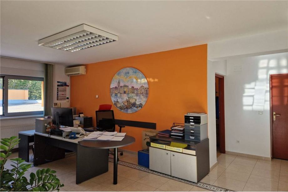 Uredski dio obuhvaća open space izložbeni prostor u prizemlju te po četiri kancelarije na prvom i drugom katu, s pripadajućim čajnim kuhinjama, toaletima i arhivom. Prostor je potpuno uređen, namješten, klimatiziran i grijan putem centralnog plinskog grijanja. Kvalitetna alu stolarija, termo fasada, kamenom popločeni zajednički prostori i parket u kancelarijama osiguravaju visoku energetsku i estetsku vrijednost. Zadnja adaptacija izvedena je 2019.