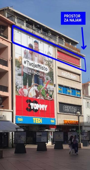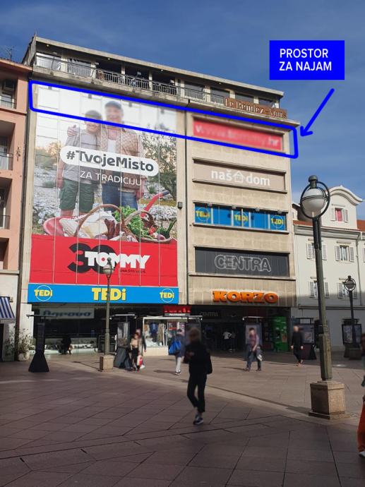 Iznajmljuje se poslovni prostor koji se nalazi na 3. katu robne kuće Korzo u Rijeci (na slikama oglasa je prikazana spomenuta robna kuća, a prostor za najam je označen plavom bojom).