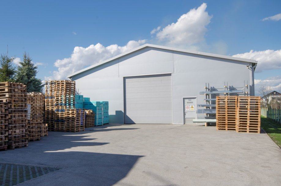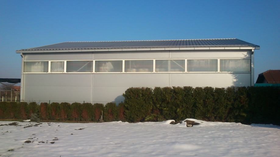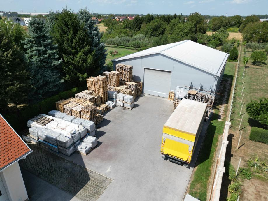 Iza objekata nalazi se otvoreno skladište površine cca 300 m2 te zatvorenog skladišta (montažna hala) tlocrtne površine 268,80 m2 sa regalnim policama za euro palete.
