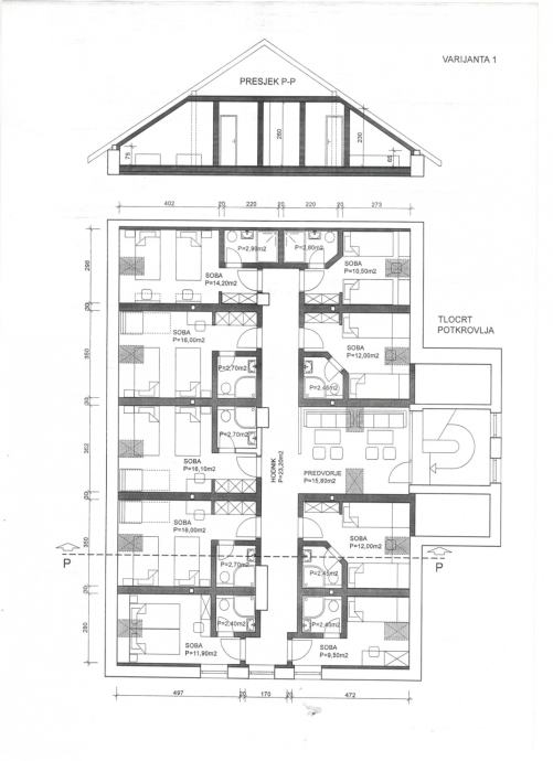 U potkrovlju hostela 220m2, moguća izgradnja 9 soba. U prilogu idejno rješenje.