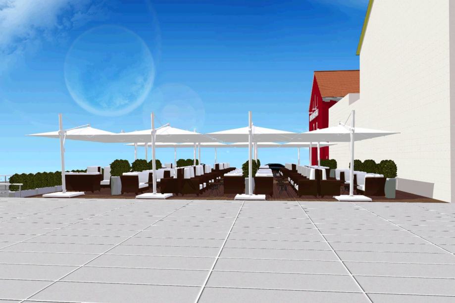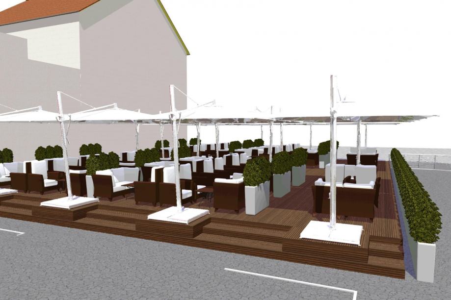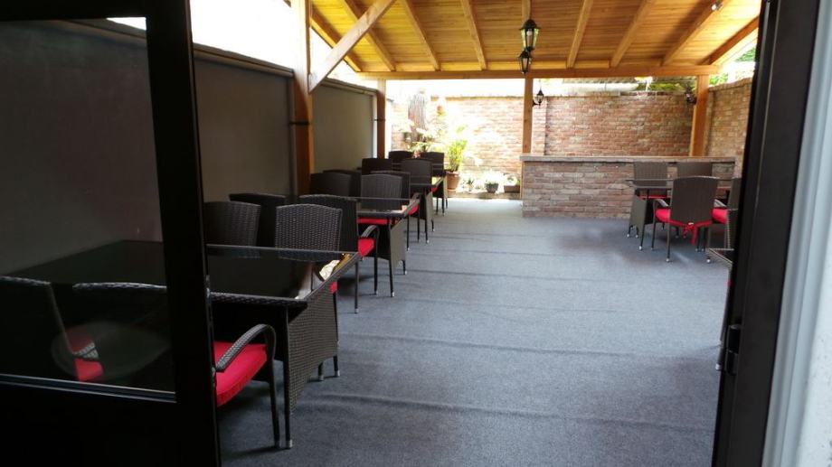 Dvorišna terasa, natkrivena sa zidanim šankom i opremom za ugostiteljstvo. 10 stolova + 40 stolica za vanjsku terasu.