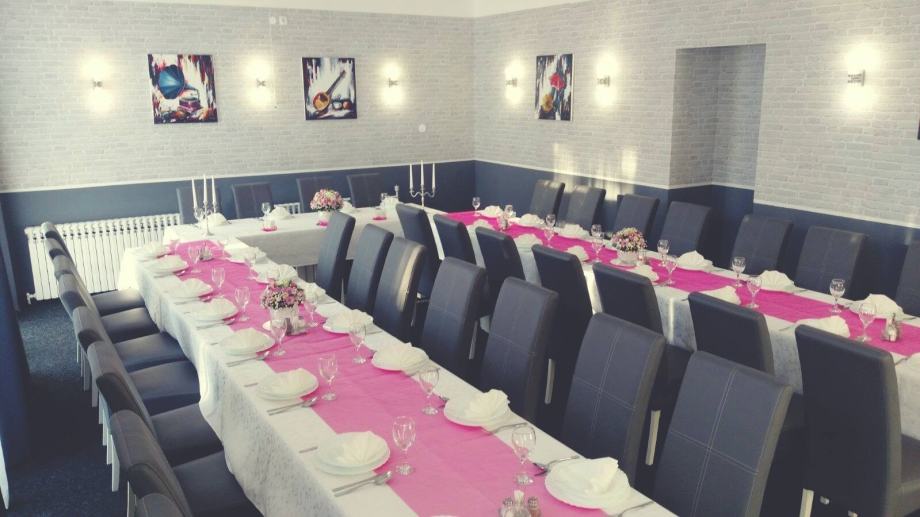kuhinjom, kompletnim inventarom šanka i posuđa za 100 osoba. Salu hostela moguće koristiti i kao kongresnu dvoranu uz projektor i platno. Provedena je restoranska rasvjeta, kongresna rasvjeta, RGB rasvjeta, TV i optika Internet.18 stolova + 100 kožnih stolica za salu,