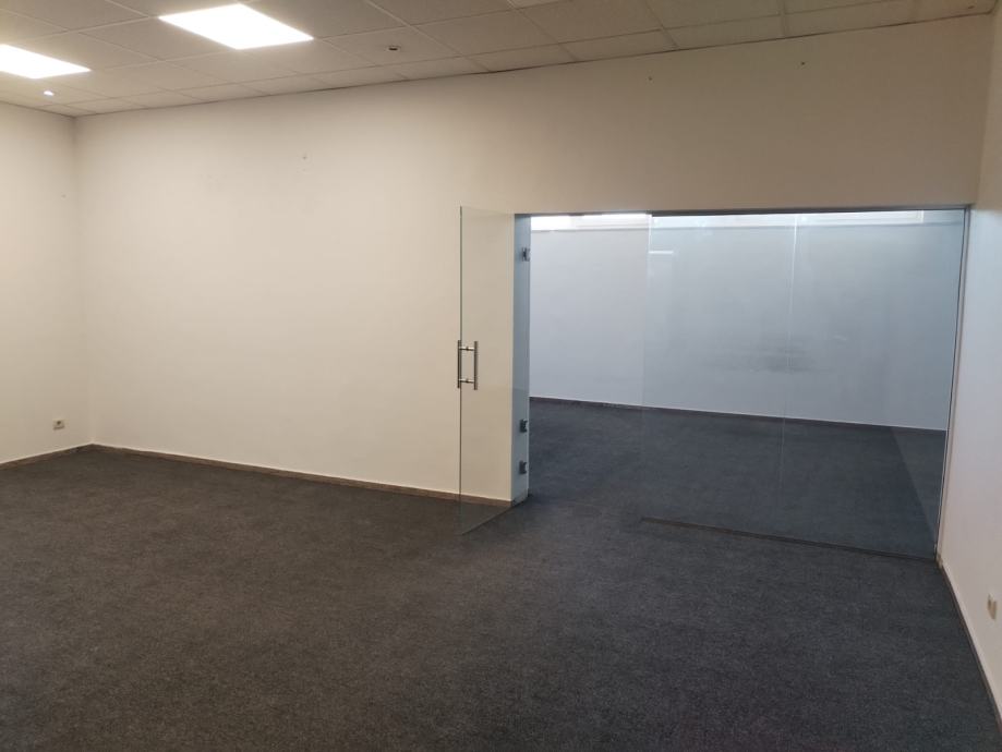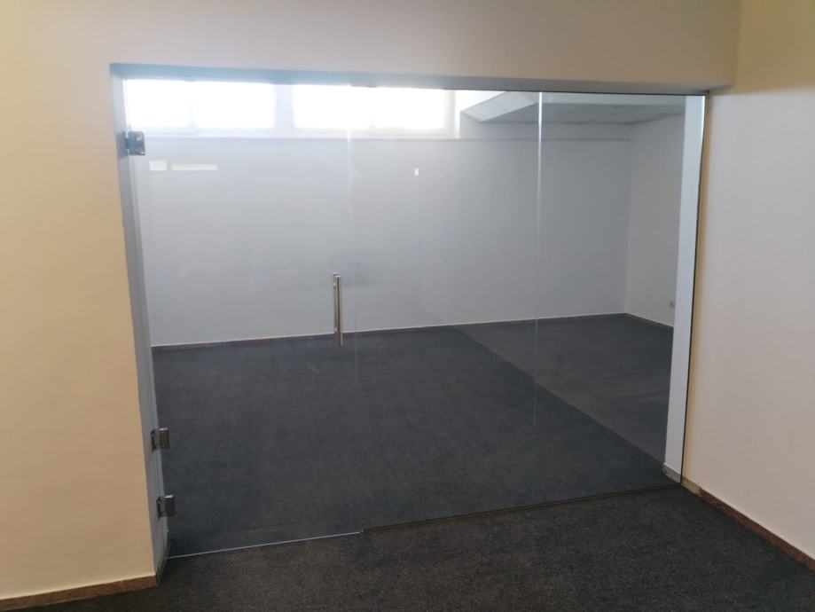 PROSTOR SE SASTOJI OD DVA DIJELA,IZMEDU KOJIH JE SIROKI PROLAZ, NA KOJEM SU STAKLENA VRATA. IMA 2 GLAVNA ULAZ IZ HODNIKA I SPOREDNI, STRAGA GDJE JE TERETNI LIFT.