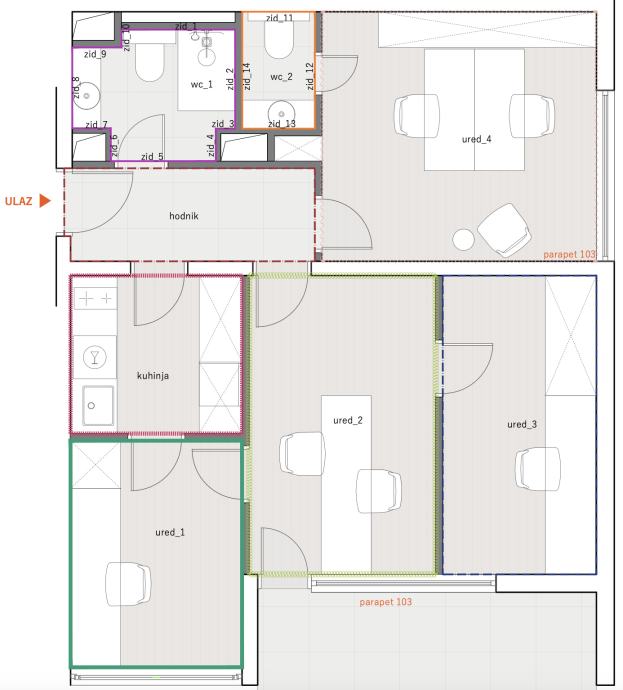 Veći ured: 13.40 m² (Ured 4 tlocrt) s vlastitim sanitarnim čvorom (1.88 m²) - orjentacije istok