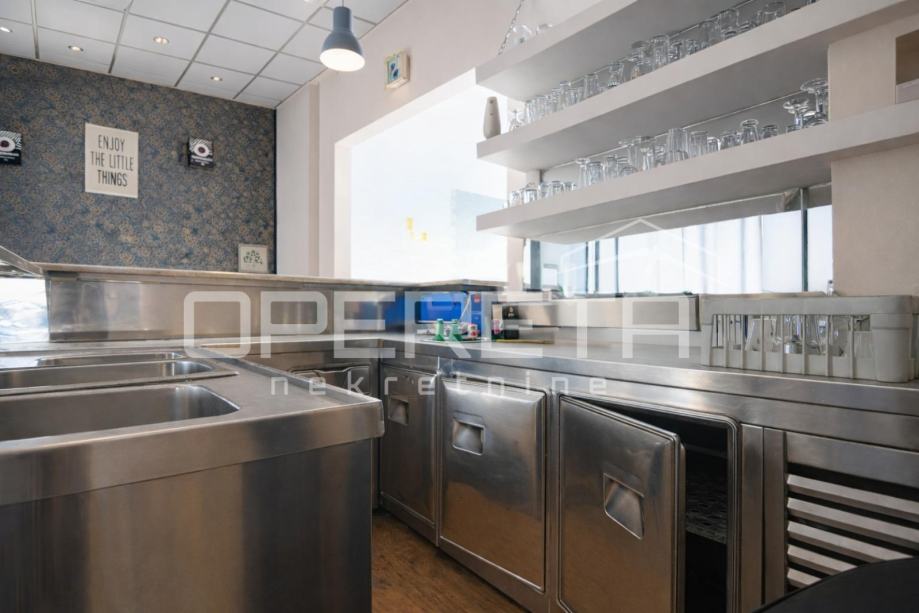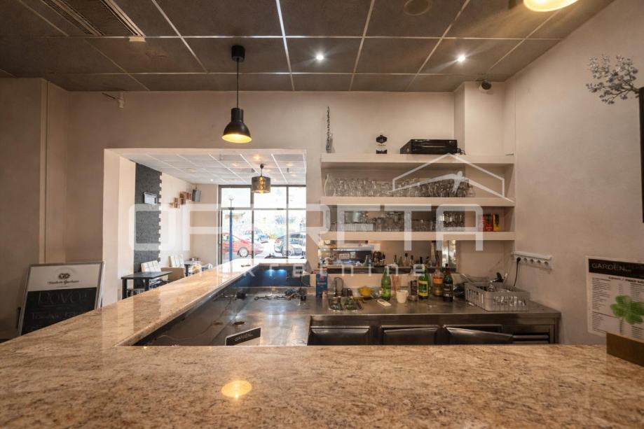 Prostor je prethodno korišten kao kafić, a unutarnji dio obuhvaća oko 70 m², adaptiran posljednji put 2010. godine, te je potpuno spreman za nastavak poslovanja. Opremljen šank omogućava brz početak ugostiteljske djelatnosti, dok prostrani stakleni otvori prema glavnoj ulici pružaju obilje prirodnog svjetla i ističu prostor izvana, čime ga čine savršenim za izlog ili druge poslovne namjene.