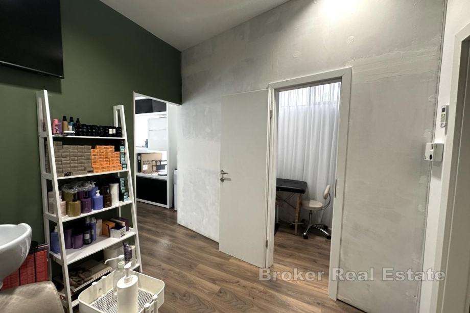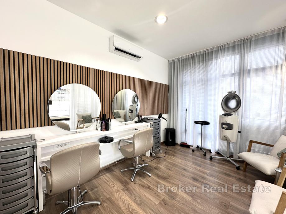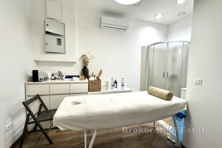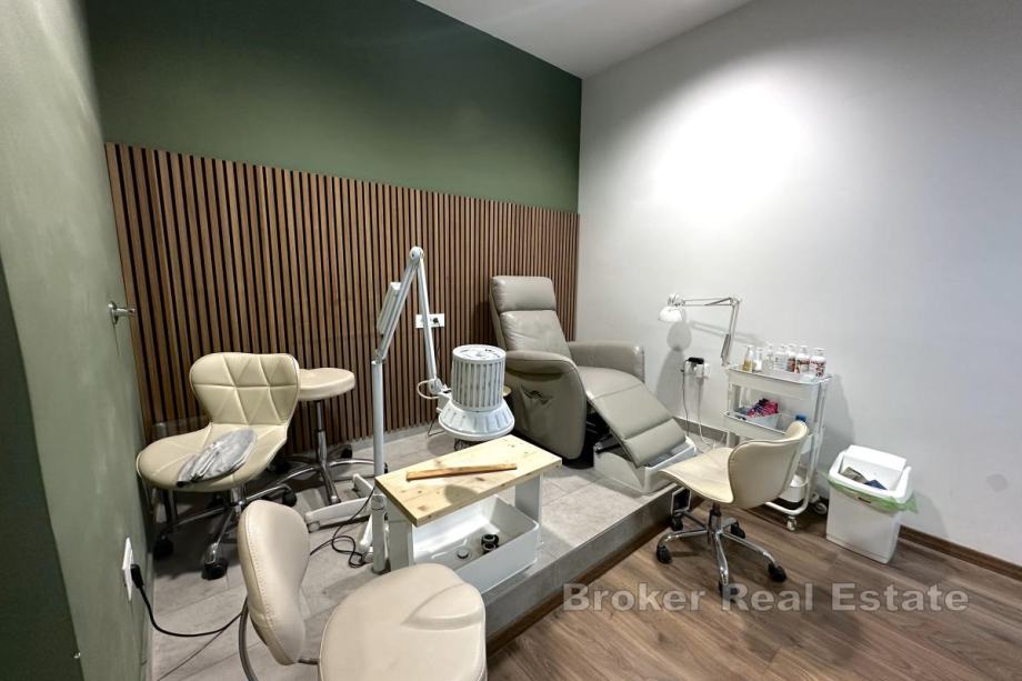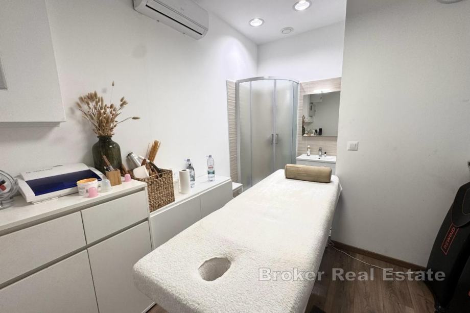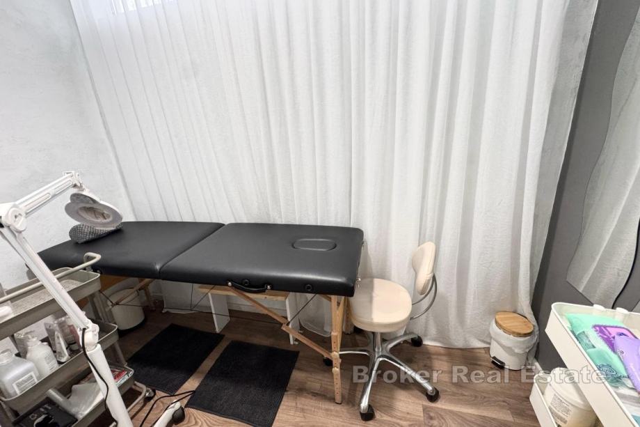 Prostor se prostire na 72 m2 i u potpunosti je renoviran i moderno namješten, spreman za nastavak poslovanja bez dodatnih ulaganja. Sastoji se od elegantne ulazne prostorije uređene za frizerske usluge, prostrane i ugodne glavne prostorije prilagođene za kozmetičke tretmane, dvije odvojene, intimne prostorije idealne za masaže i druge specijalizirane tretmane te sanitarnog čvora.
