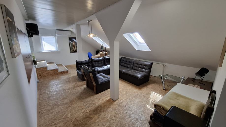 Dnevni boravak, veliki krevet na podestu, kupaonica