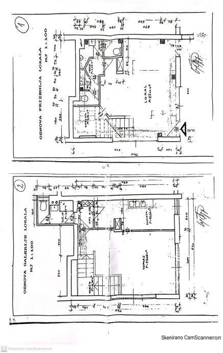 Opis unutrašnjosti: dva ulaza u prostor. Unutarnje stubište, centralni prostor, priručno skladište, sanitarni čvor sa predprostorom (odvojeno za ž/m), na katu centralni prostor, prostor za pripremu hrane, sanitarni čvor sa predprostorom za osoblje), veliki zidni prozori na dva zida Prazan prostor, bez namještaja i opreme. ,:·