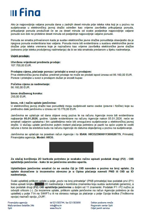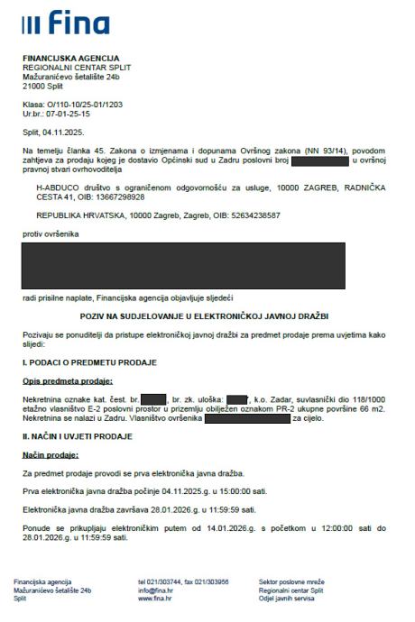 Pozivaju se svi zainteresirani kupci da pristupe EJD na stranicama FINA-e, a dražbovanje je zakazano za period od 14.1.2026.-28.01.2026. godine.