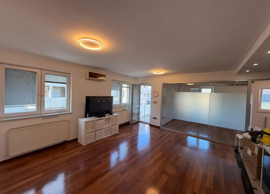 Iznajmljuje se prostor na prvom katu poslovne zgrade u Baštijanovoj ulici. Prostor ukupno broji 75 m2. Prostoru pripada balkon i vanjsko parkirno mjesto. Prostor je upravo adaptiran i spreman za korištenje. Otvorenog je koncepta te ga možete lako urediti prema svojim potrebama. S lijeve strane imate otvoreni koncept uz kuhinju, dio uredskog prostora te izlaza na balkon. Dok je sa desne strane staklena stijena koja dijeli konferencijski prostor. Također imate prostranu kupaonicu sa velikim ormarom preko cijelog zida koji može služiti za potrebe arhive. Cijena najma je 1.000,00 EUR + režije koje idu po obračunu na brojilu od stana.