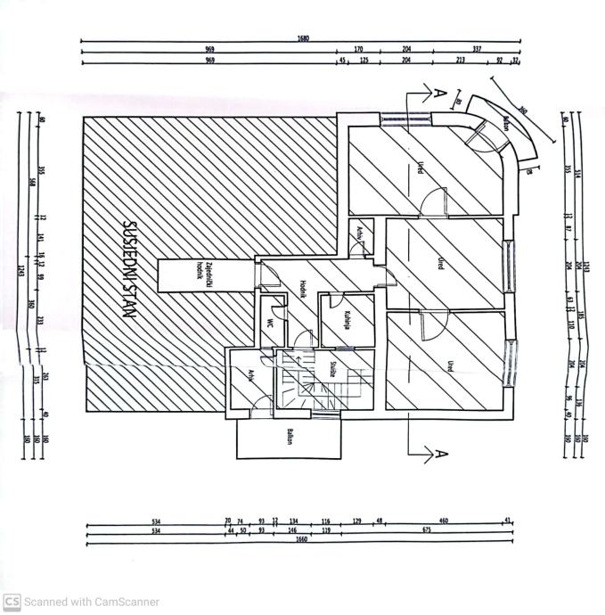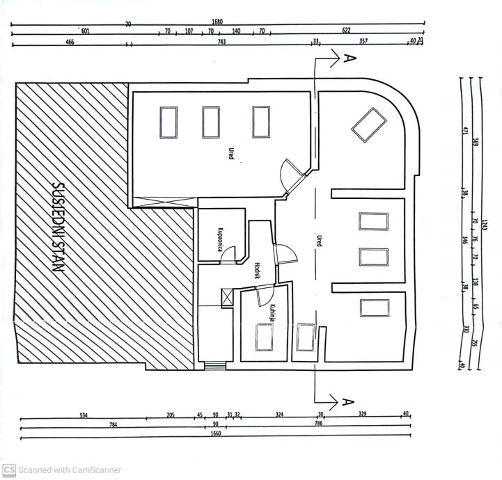 • Prvi kat (111,14 m²): Sadrži hodnik, tri ureda, dva spremišta/arhive, kuhinju, WC, dva balkona i stubište koje vodi u potkrovlje.