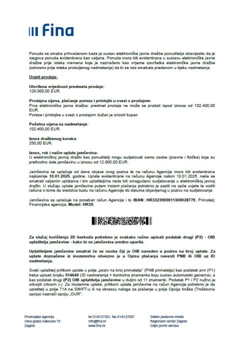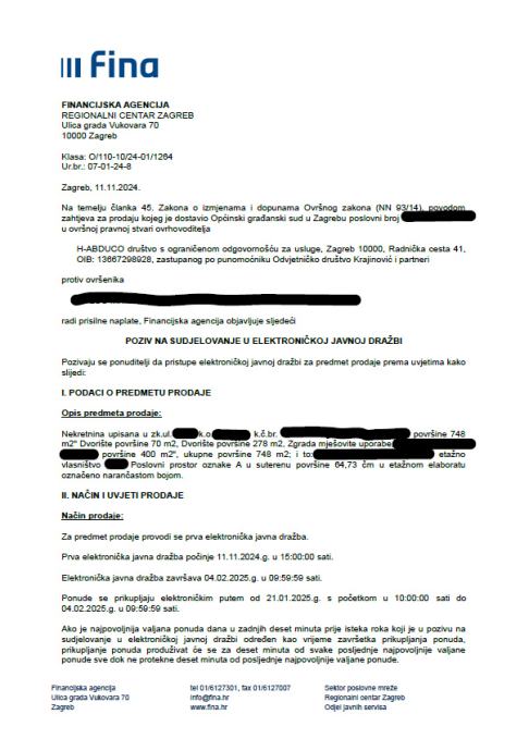 Pozivaju se svi zainteresirani kupci da pristupe EJD na stranicama FINA-e početak dražbovanja 21.01.2025.