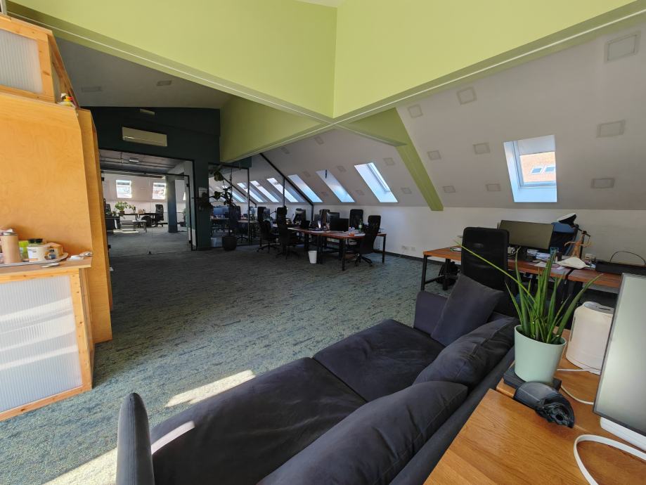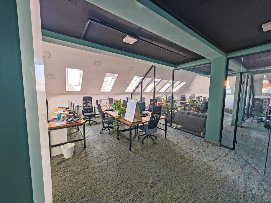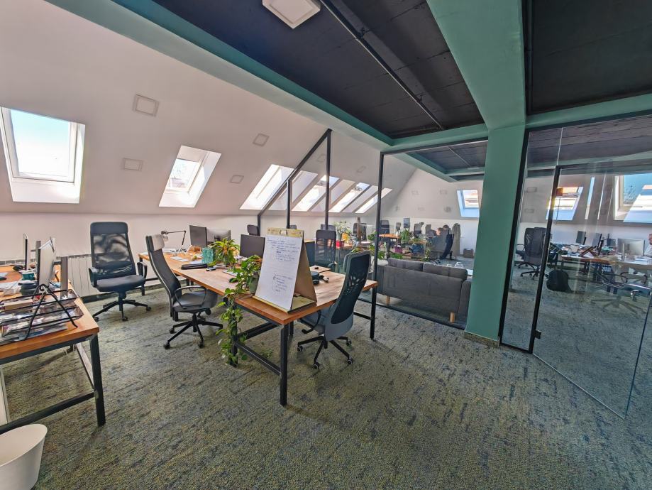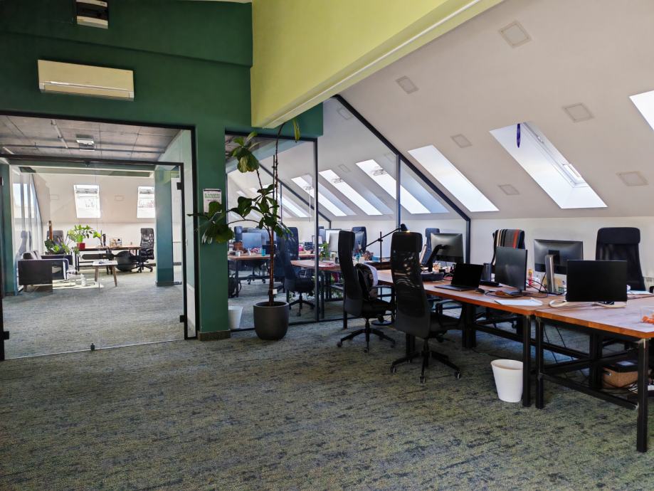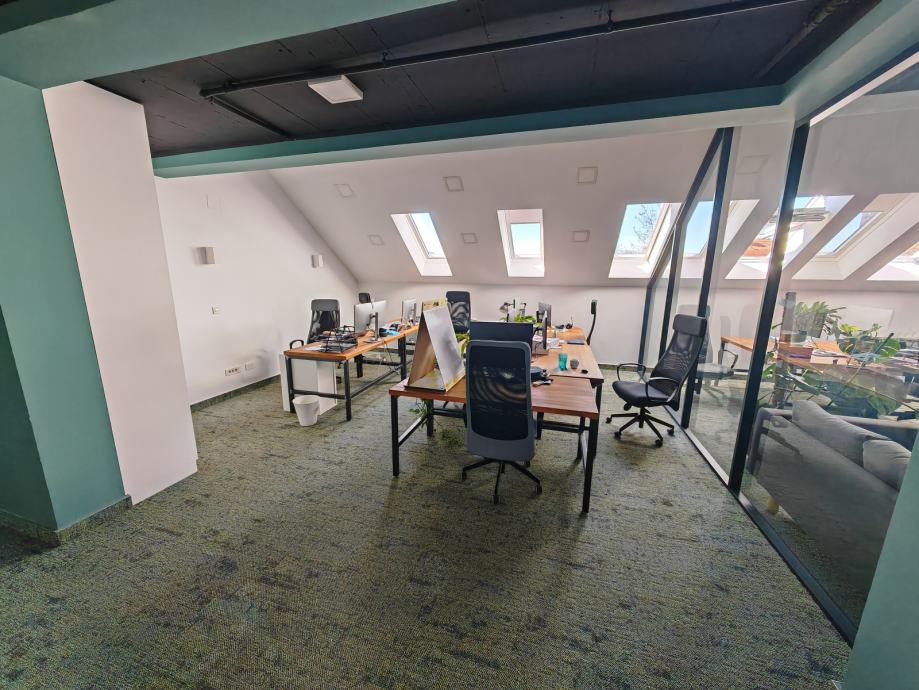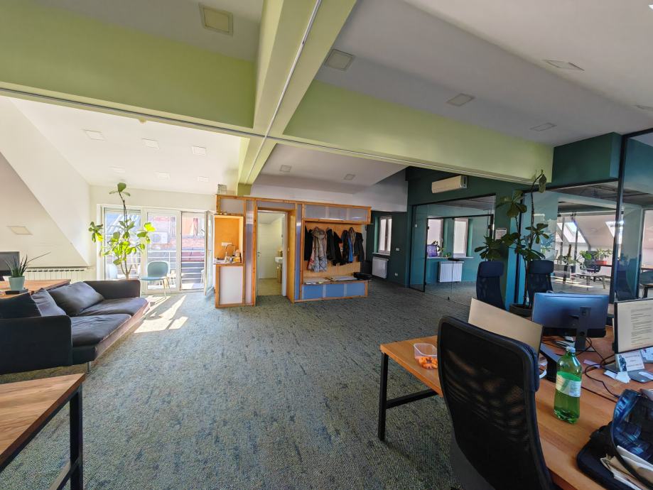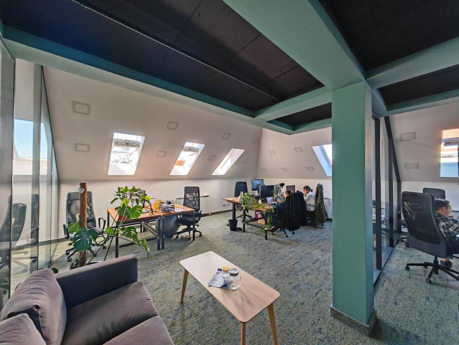 Ured je dizajnerski uređen, te se sastoji od open space prostora i nekoliko prostorija koje su pregrađene staklenim pregradama, balkona, čajne kuhinje i dva sanitarnog čvora M+Ž.