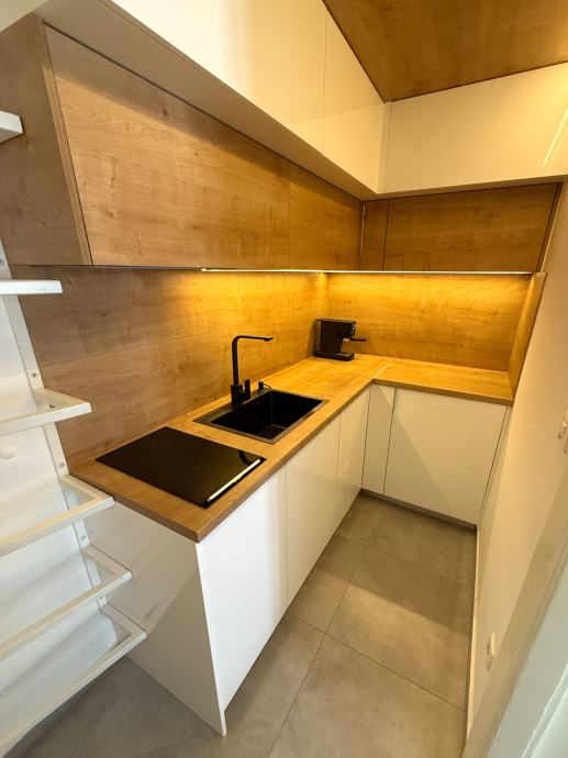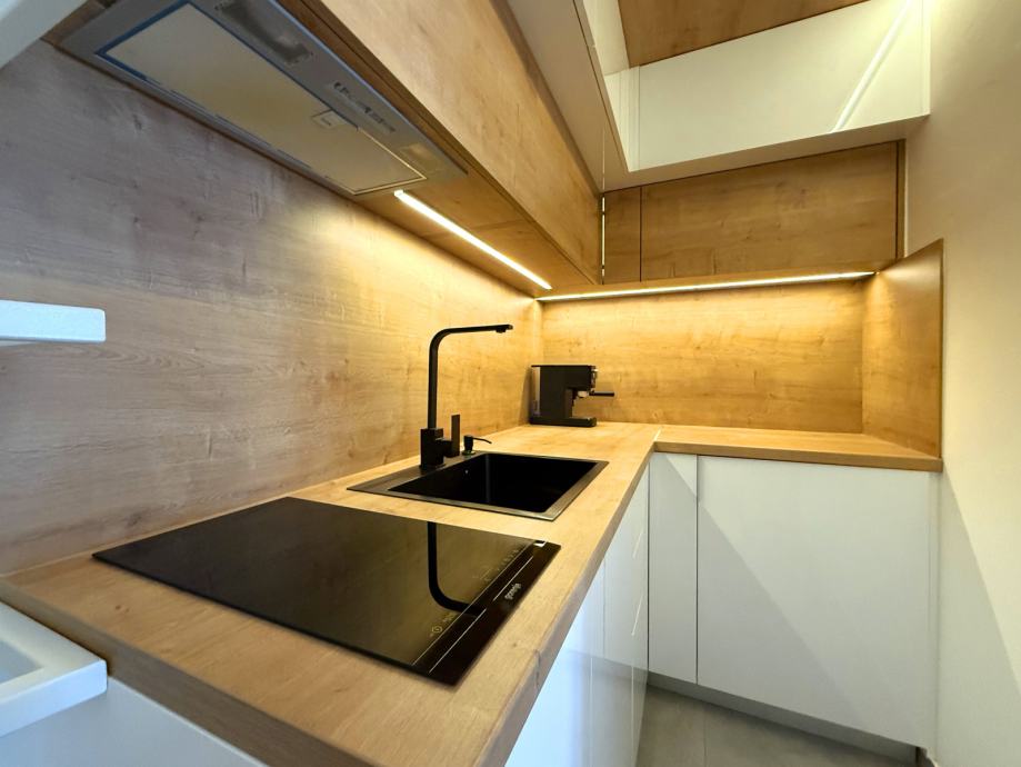 - indukcijska ploča, napa, frižider, crni inox sudoper (topla voda), kuhalo