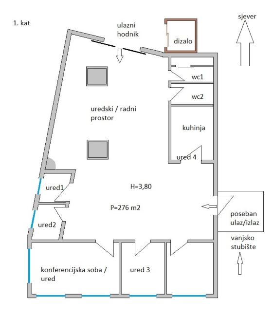Daje se u dugoročan zakup multifunkcionalan, vrlo moderan i suvremen poslovni prostor ukupne površine 276 m2 koji se nalazi na 1.katu poslovnog objekta na istočnoj strani Zagreba, ul. kneza Branimira.