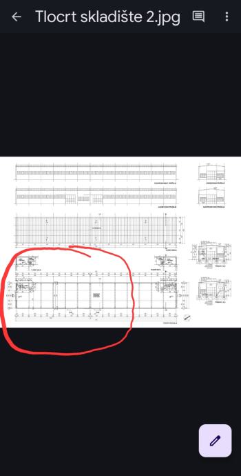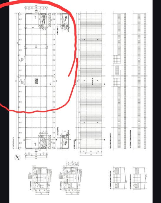 Trenutno se objekt obnavlja. U tlocrtu prikazano grafički dio koji se iznajmljuje. Odvojeni prilaz i ulaz u južni dio objekta; postoji i natkriven dio u vanjskom krugu od 200m2 koji ide uz skladište; rolo vrata (moguć ulazak visokih vozila u halu); odvojen sanitarni čvor i postojeći ured na katu.