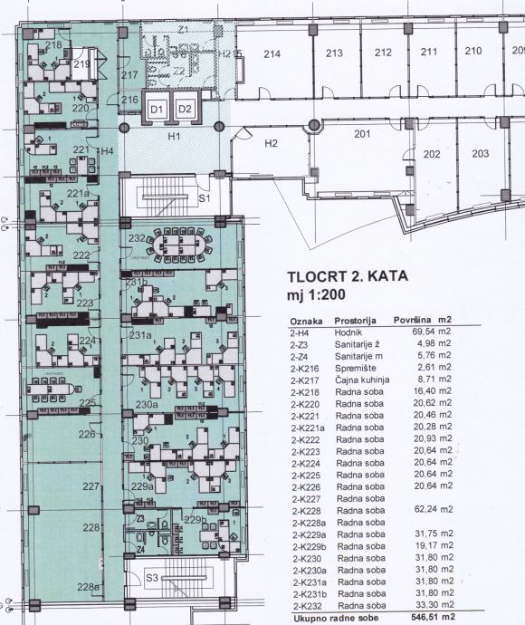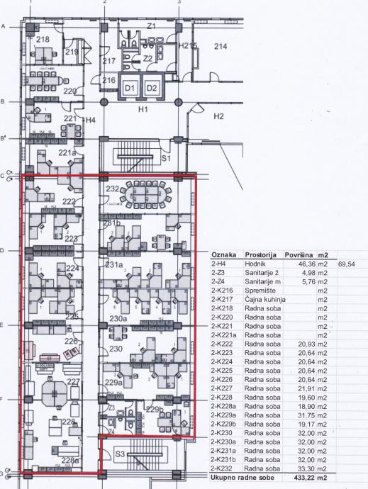 - 19 uredskih soba (po potrebi i željama najmoprimca dimenzije se mogu sa prijenosnim zidovima mijenjati)
