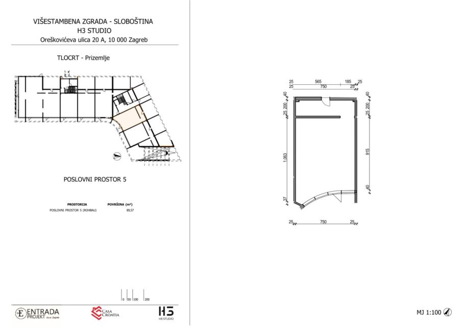 Prodaje se roh-bau poslovni prostor površine 89,57 m2 u prizemlju zgrade u izgradnji u Oreškovićevoj ulici 20A s ukupno 86 stanova, orijentiran prema jugu.
