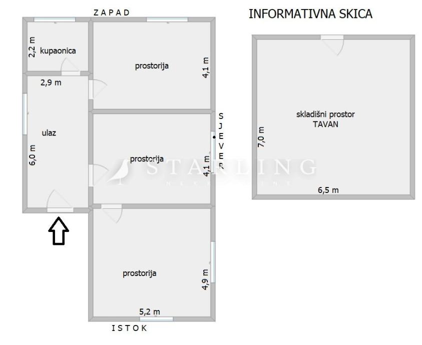 U prizemlju se nalaze 4 prostorije i kupaonica, a tavan je moguće iskoristiti kao skladišni prostor. Kvadratura tavana nije iskazana u ukupnoj kvadraturi kuće.