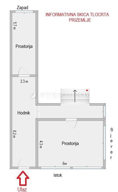 Poslovni prostor sastoji se od dvije prostorije i hodnika u prizemlju te dvije prostorije, kuhinje i kupaonice na polukatu.