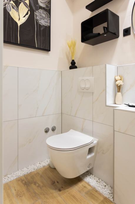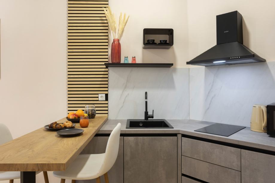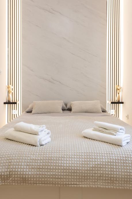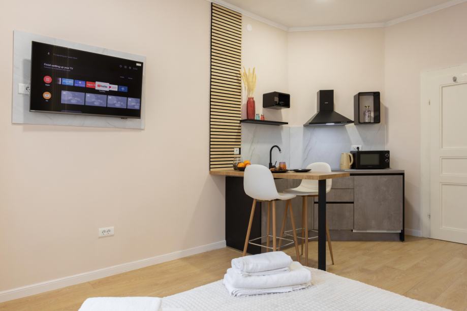 Kuhinja je opremljena mašinom za suđe, frižiderom sa zamrzivačem, indukcijskom pločom, mikovalnom pečnicom i napom. Na centralom zidu nalazi se Phillips Smart TV s android sustavom, na kojem možete gledati youtube ili netflix. Kupaonica ima walk in tuš, fen i sve kupaonske potrepštine. Za ugodno iskustvo spavanja tu je king size krevet (160*200) s najkvalitenijim madracem i ambijentalnom rasvjetom. Wifi visoke brzine je u cijelom prostoru.