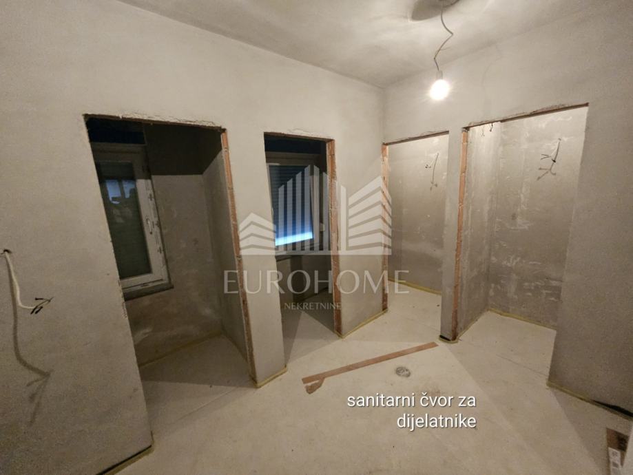 Prizemlje se sastoji od servisne radionice i sanitarnog čvora, poslovnog prostora te ulaza sa stubištem i dizalom za poslovne prostorije i stan na katu i u potkrovlju.
