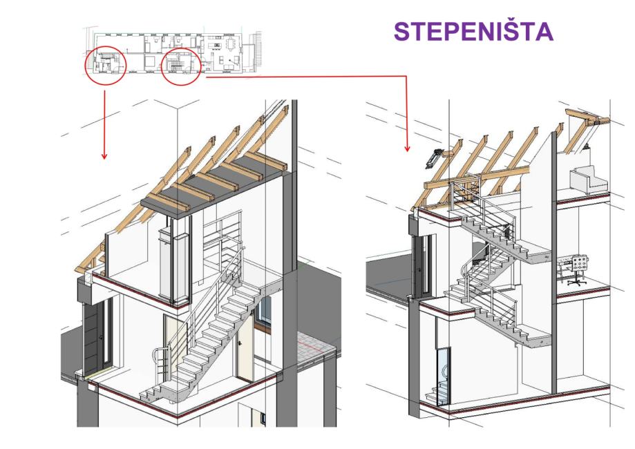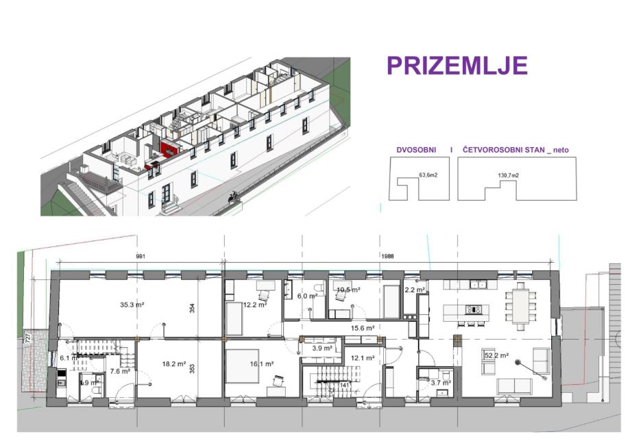 U prizemlju se nalazi etažirani stan, ukupne korisne površine od 141 m2, 17 m2 terase te tavanskog prostora površine 141 m2. Tavanski prostor se može prenamijeniti u potkrovlje. Prema idejnom projektu, stan u priezmlju bi ostao jedan veliki 4-sobni stan, dok bi se u potkrovlju izvela 2 dvosobna i 1 trosobni stan.