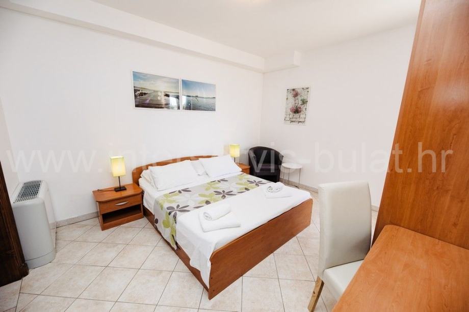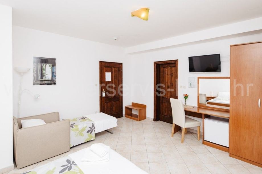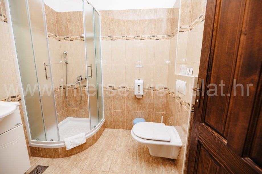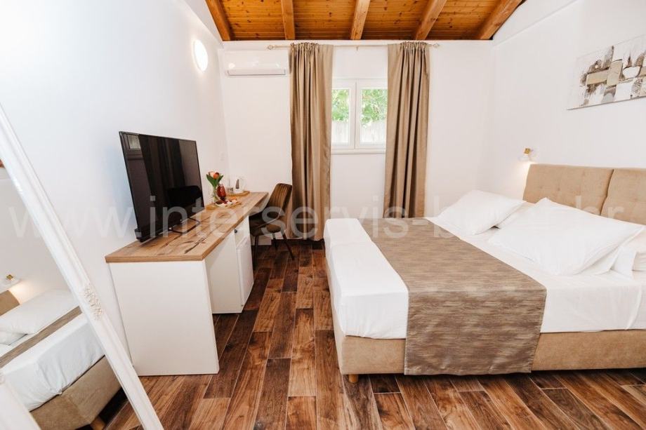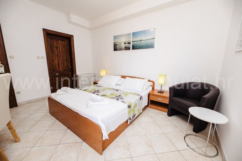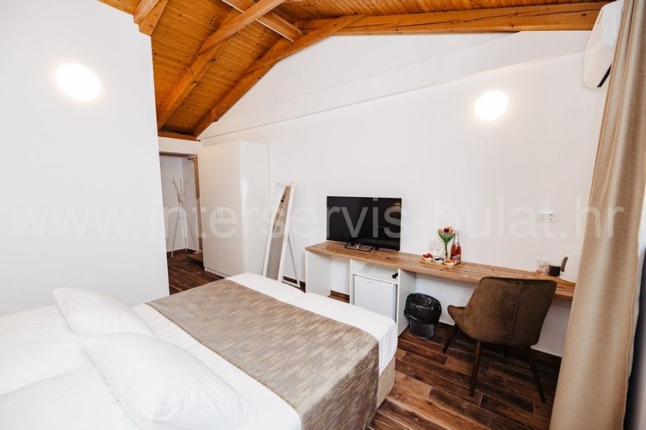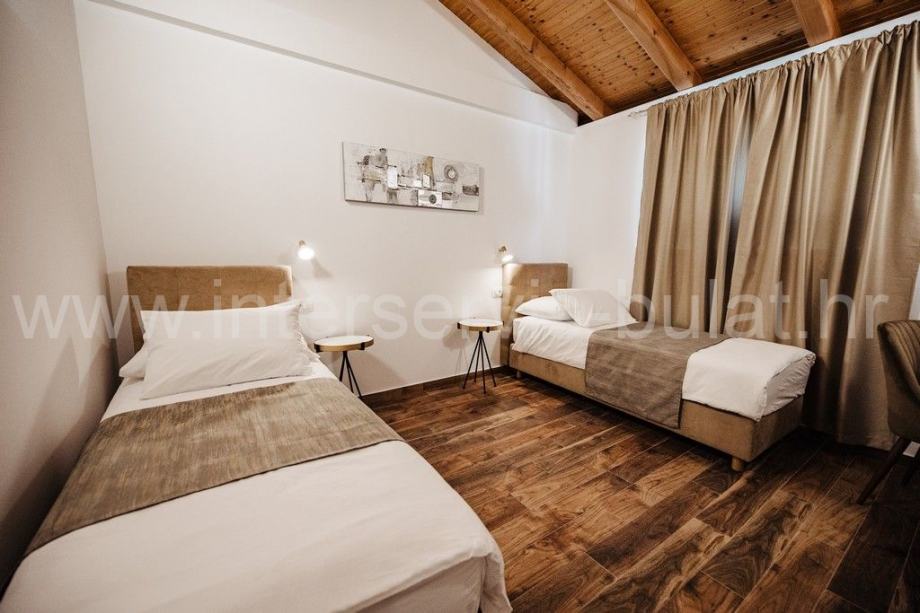 Kuća raspolaže sa unutarnjim stepeništem i liftom kojima se penjemo na tri kata gdje na svakom nalazimo po pet spavaćih soba, svaka s balkonom i kupaonicom. Cijela nekretnina je uređena, održavana i sobe se iznajmljuju kroz cijelo ljeto.