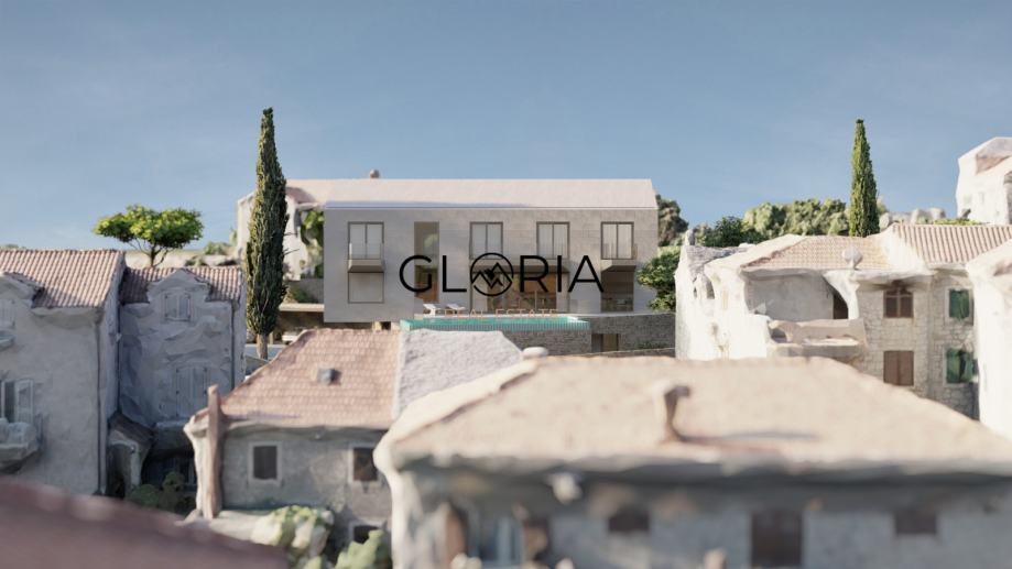 Teren je idejnim rješenjem podijeljen u dvije razine - jedna u visini glavnog (kolnog i pješačkog) prilaza sa istoka, a druga 3 m iznad u visini otvorenog pogleda prema moru i kopnu u daljini preko najisturernijih streha. Etaža prizemlja djelomično je usječena u teren i dio je "baze" na koju se postavlja glavni objekt - dvoetažni volumen s kosim krovom po uzoru na kontekst, a i u skladu sa smjernicama za projektiranje u B zoni zaštite. Taj volumen je pozicioniran na bazu tako da djelomično konzolno izbije prema istoku gdje formira natkriveni (glavni) ulaz u objekt te zabatom bez otvora naglašava svoju umjerenu monumentalnost. S obzirom na maksimalnu tlocrtnu izgrađenost od 225 m2, postojalo je ograničenje u vidu elemenata koji se ubrajaju u izgrađenost, a to su: stambena zgrada, bazen (podignut iznad tla) te terasa na sjevernoj strani (uz bazen). Kako bi se zadovoljio maksimalni koeficijent izgrađenosti, izrezuju se "dvorovi" unutar baze, tako da etaža prizemlja, u kojoj su smješteni pomoćni prostori te wellness i teretana, dobije svjetla i zraka, ali i intimnost od pogleda. U razini prvog kata nalaze se dnevni prostori koji na tri strane izlaze na terasu, a na sjevernoj strani preko preljevnog bazena gledaju u daljinu prema moru. Na drugom katu smještene su četiri spavaće sobe s vlastitim kupaonicama i balkonima. Sve tri etaže od ulaza u prizemlju do drugog kata povezane su stubištem smještenim u otvorenom višeetažnom prostoru. U projekt je moguće ubaciti i zatvorenu garažu te dizalo.