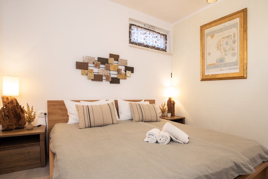 Stan se sastoji od jedne spavaće sobe sa bračnim krevetom, kupaonica s tušom i WCom, kompletno opremljena kuhinja, prostrani dnevni boravak sa blagovaonskim stolom. Krevet je potpuno novi kao i madraci koji su jako udobni.