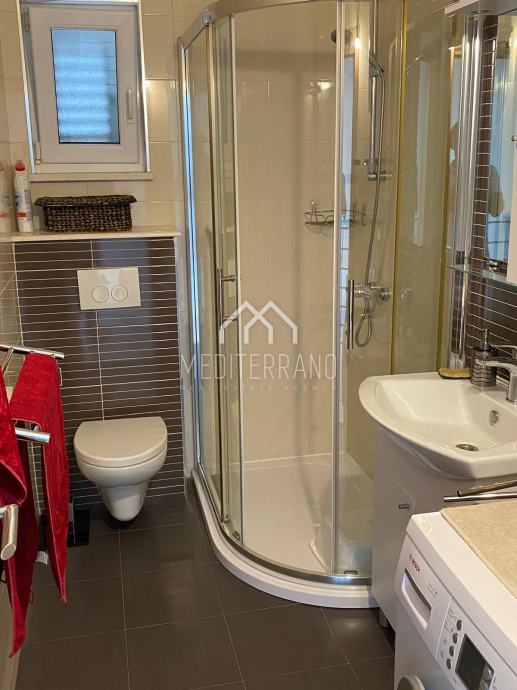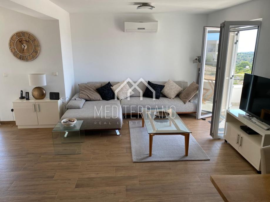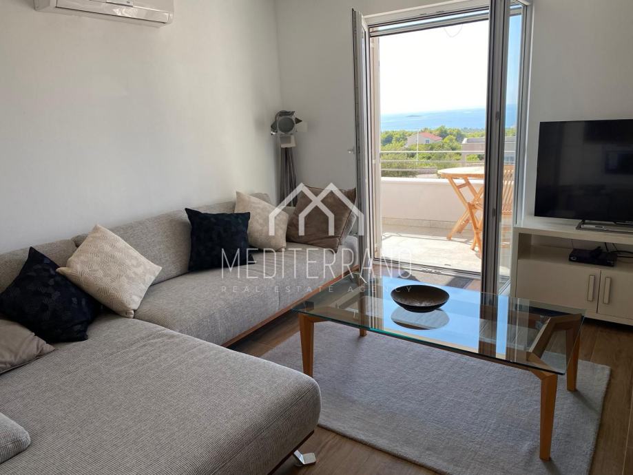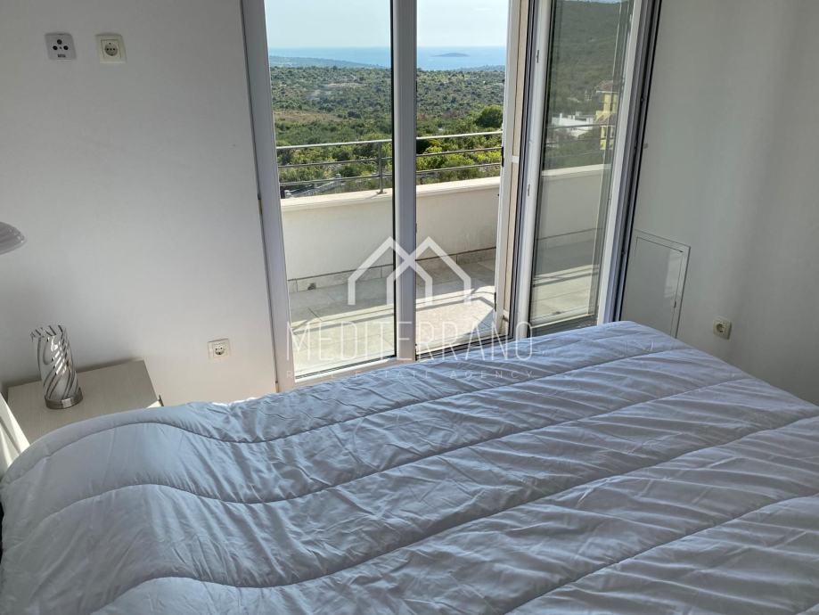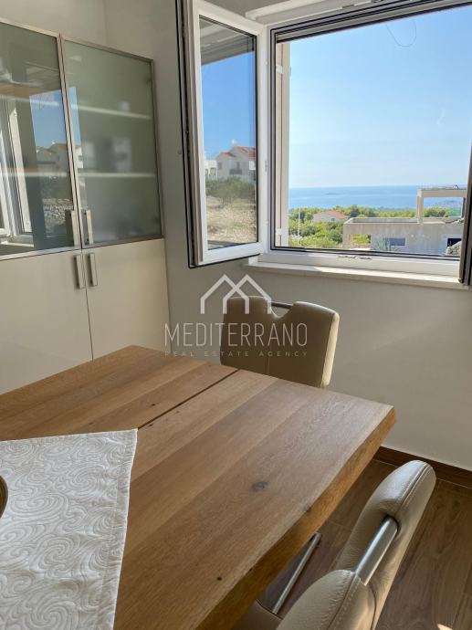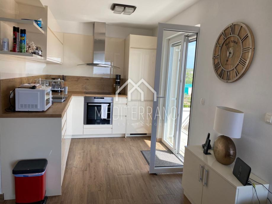 Iz stana se pruža predivan pogled na more, što dodatno doprinosi osjećaju mira i opuštanja. Etažna raspodjela prostora omogućuje odvojenost dnevnog i privatnog dijela, čime se postiže veća privatnost i komfor.