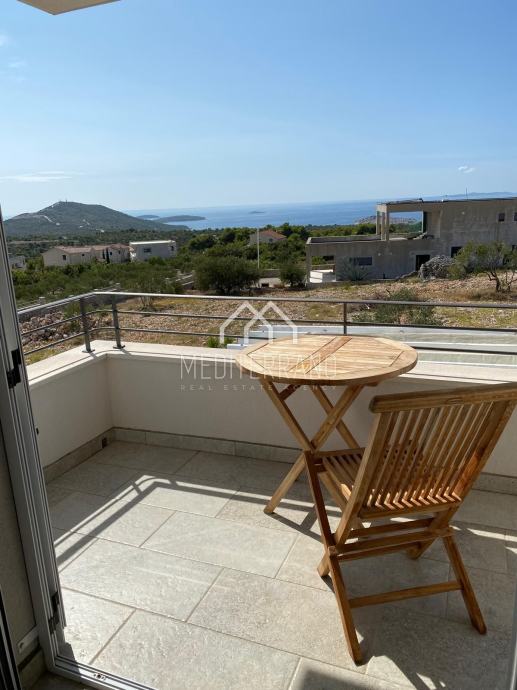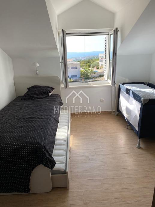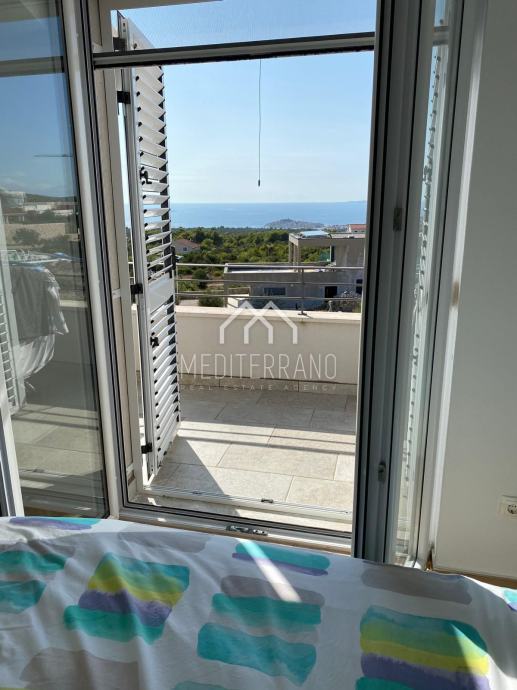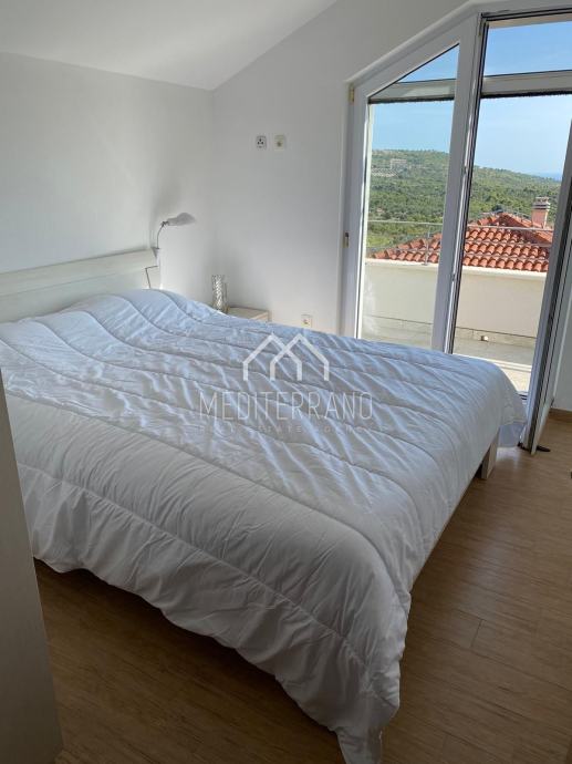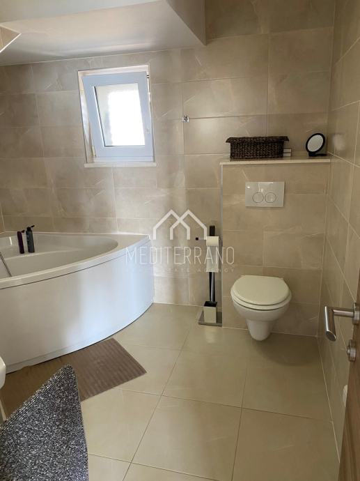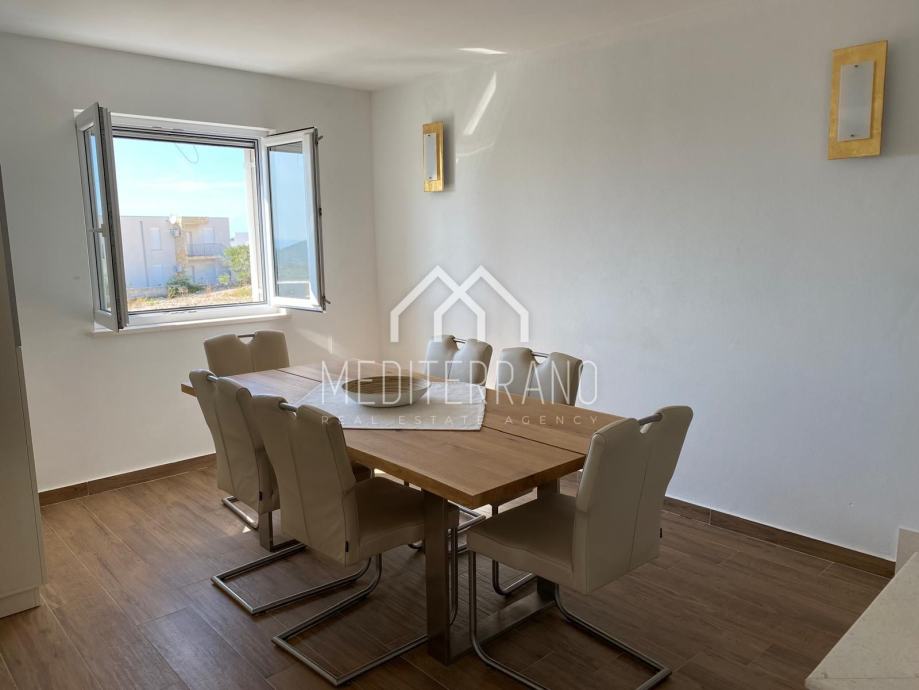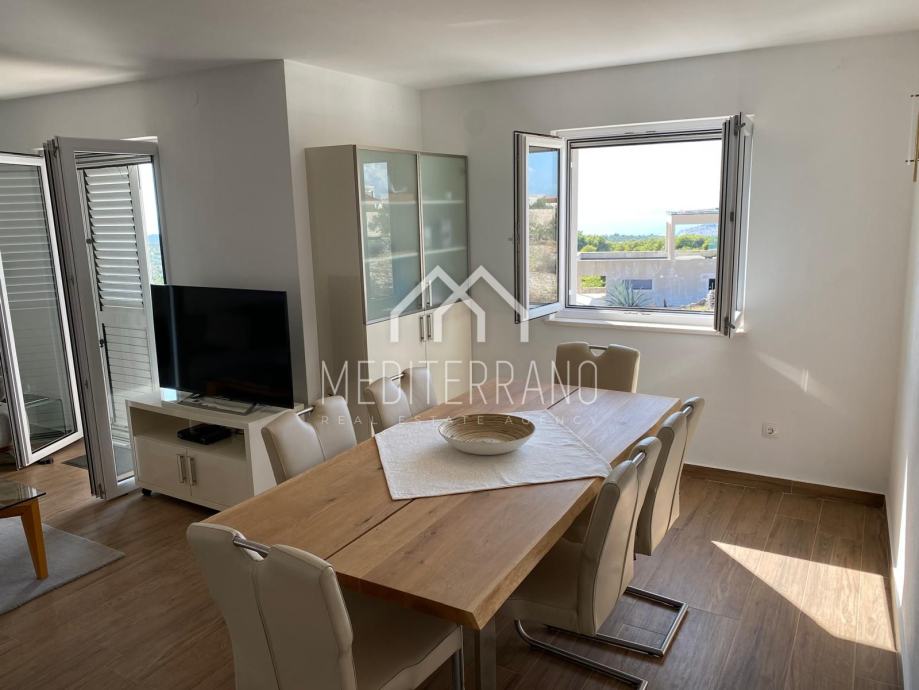 Iz stana se pruža predivan pogled na more, što dodatno doprinosi osjećaju mira i opuštanja. Etažna raspodjela prostora omogućuje odvojenost dnevnog i privatnog dijela, čime se postiže veća privatnost i komfor.