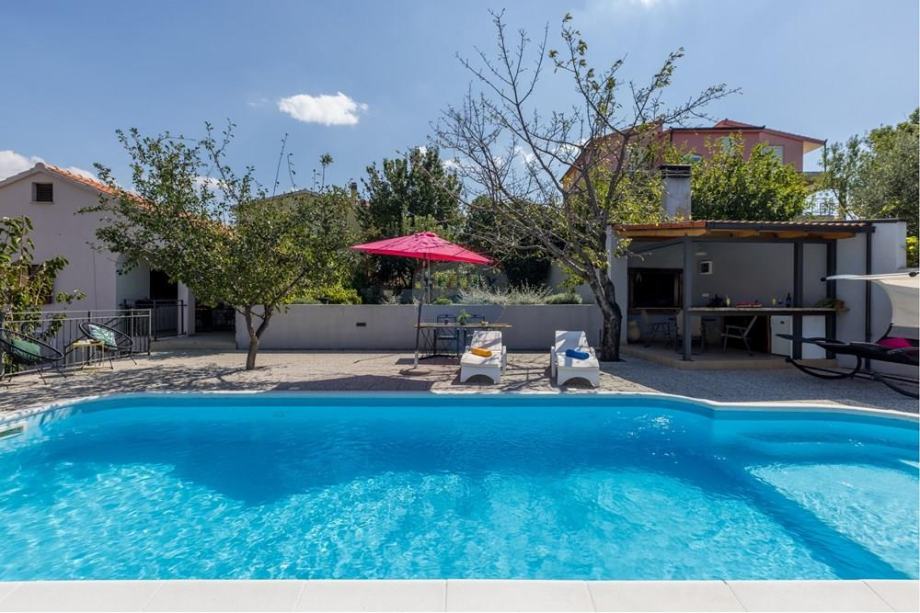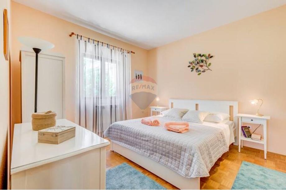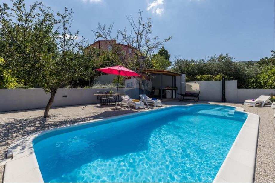 Okružena zelenilom i tišinom, ova kuća s privatnim bazenom nudi idealno utočište za sve koji traže mir, privatnost i sklad s prirodom. Potpuno je namještena s prostranom kuhinjom, blagovaonicom i dnevnim boravkom koji odiše toplinom doma. Dvije udobne spavaće sobe i elegantno kupatilo, uz centralno grijanje, jamče komfor tijekom cijele godine. Postoji također dodatna dvokrevetna soba sa kupatilom na donjoj etaži kuće.