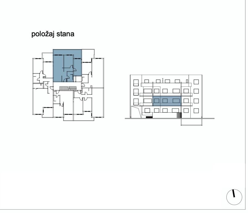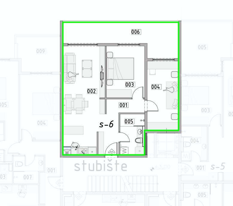 Stan S-6 – 1. kat – stambena površina 58,01 m2 (2 spavaće sobe + kupaonica) + natkrivena terasa (15,70 m2 SZ) + vanjsko parkimg mjesto PM10 (12,50 m2) + ostava u podrumu (6,75 m2), ukupno neto obračunske površine 74,05 m2 = 330.000 EUR