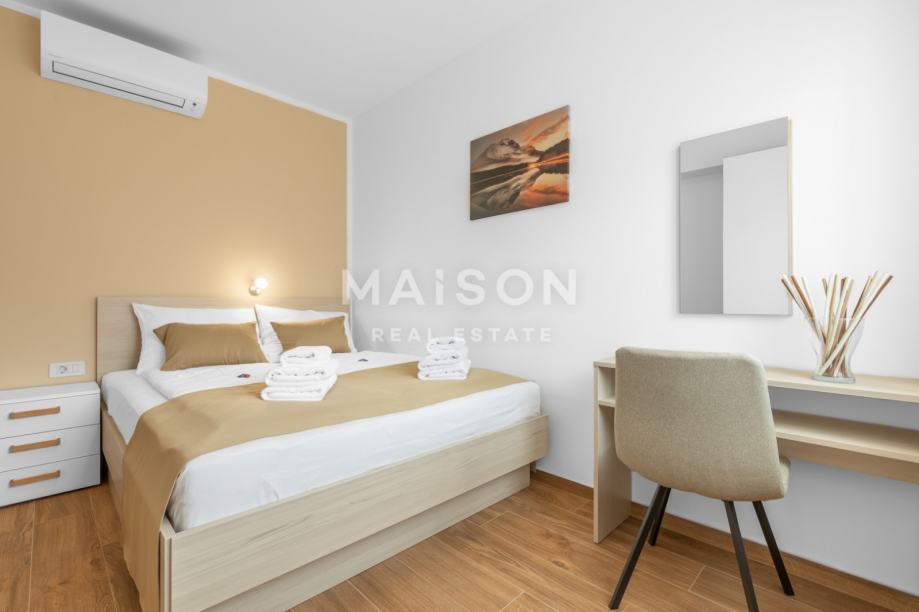 Stan se nalazi na 1. katu stambene zgrade te je u potpunosti namješten i opremljen. Sastoji se od tri spavaće sobe, dnevnog boravka, blagovaonice, kuhinje, dvije kupaonice, ostave i terase. Stan je klimatiziran, ima privatni ulaz te nudi dodatnu razinu udobnosti zahvaljujući hidromasažnoj kadi i prekrasnom pogledu na more. S terase se pruža ugodan prostor za boravak na otvorenom.